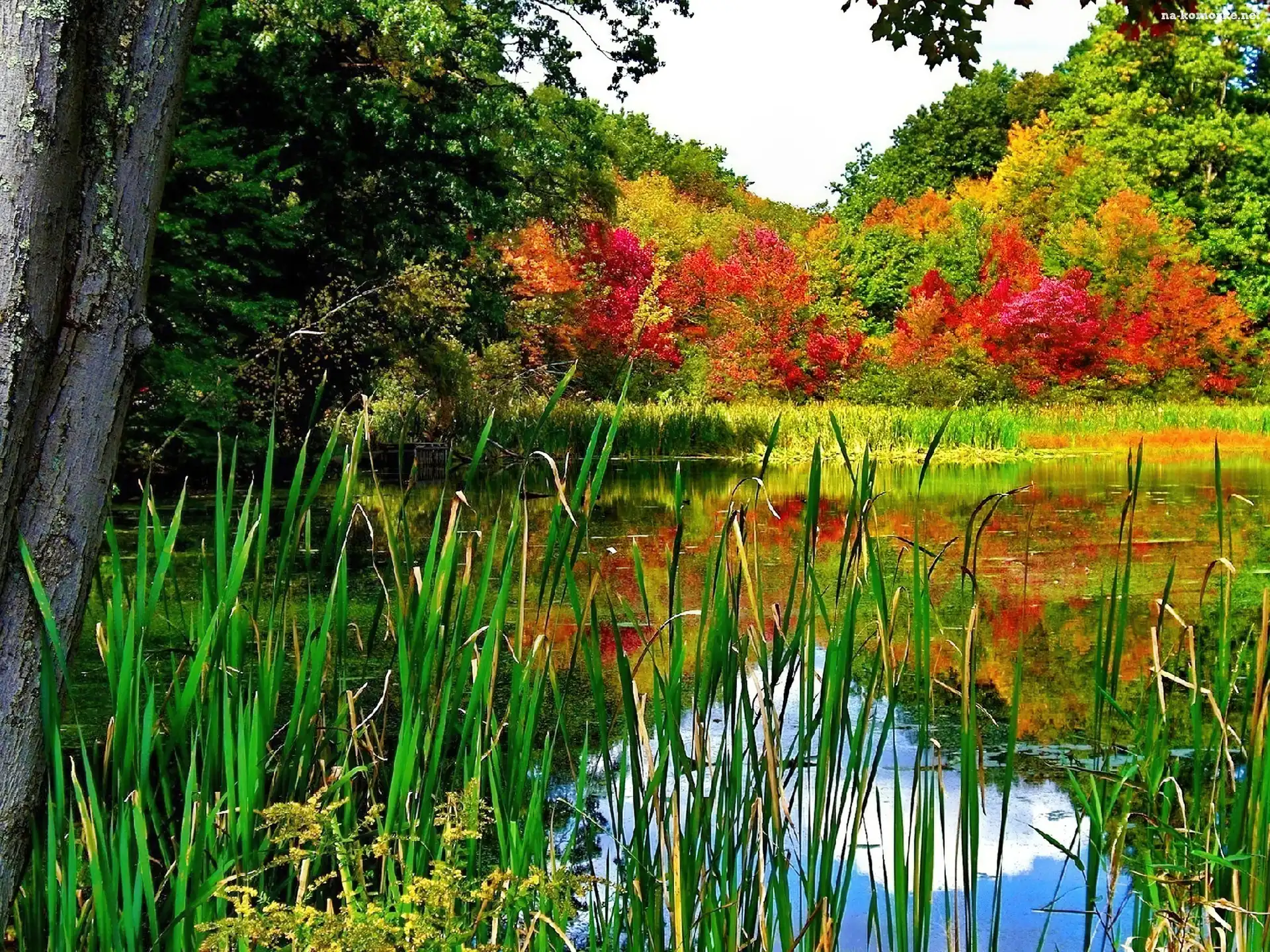 Jezioro, Drzewa, Szuwary, Jesienne na Komórkę