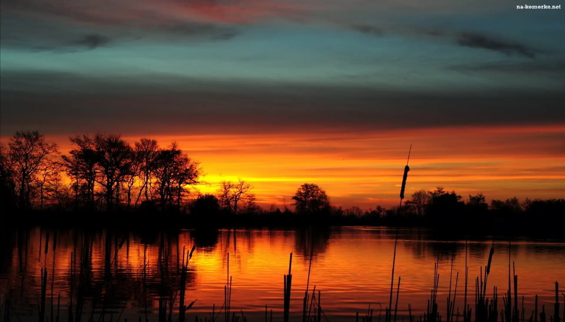 Jezioro, Zachód Słońca, Szuwary, Drzewa na Komórkę