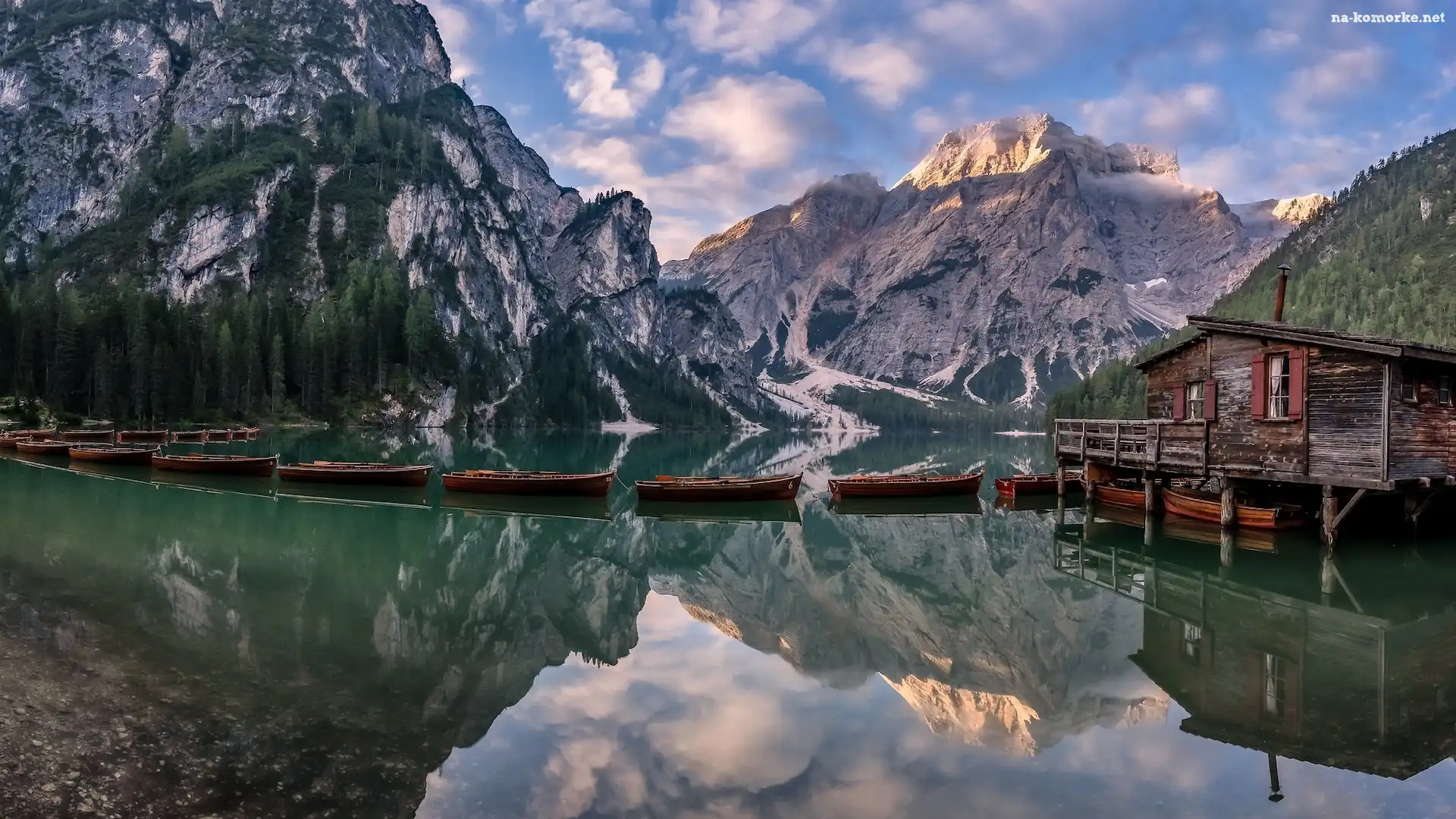 Włochy, Domek, Pragser Wildsee, Łódki, Jezioro, Lago di Braies, Góry Dolomity, Drewniany na Komórkę