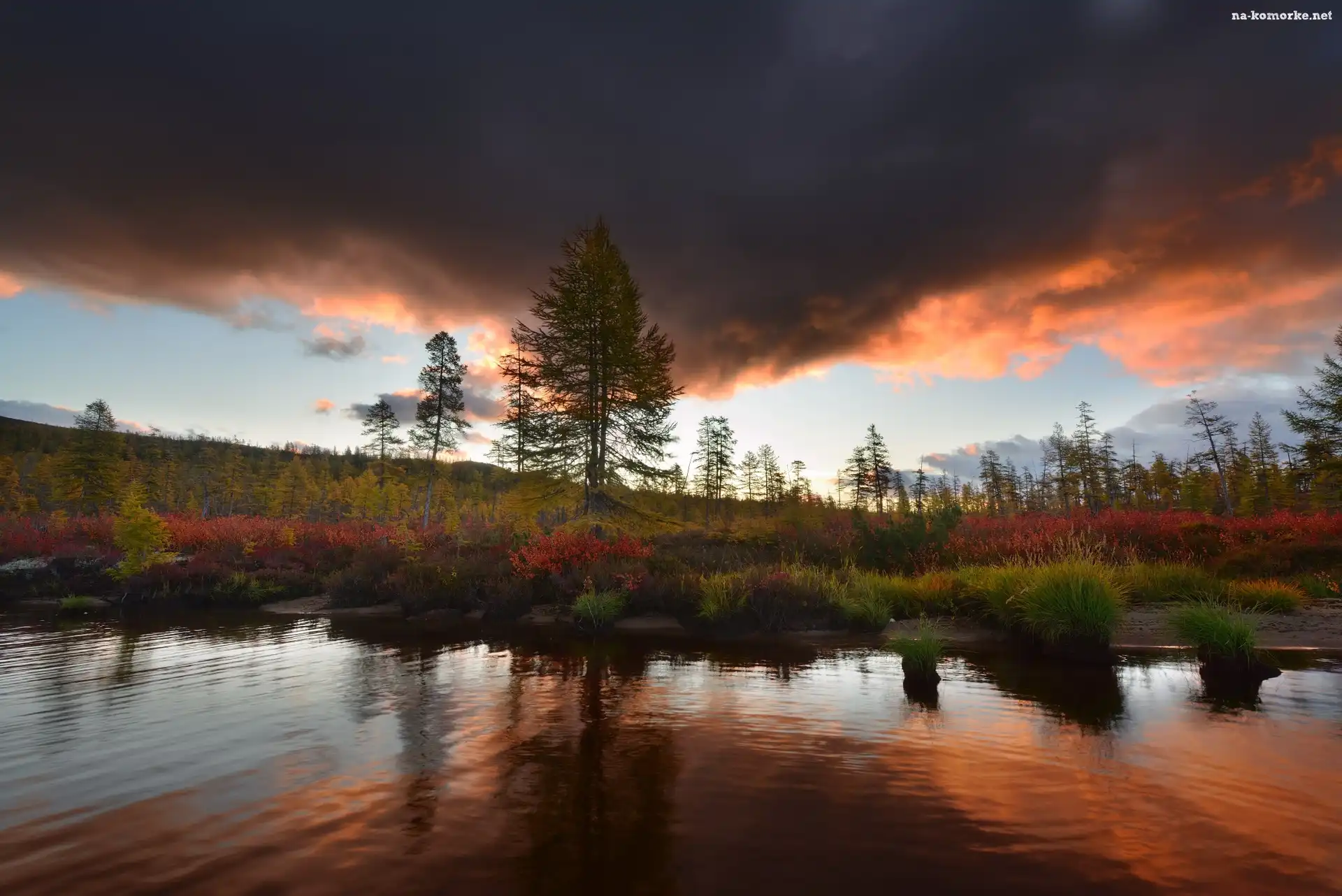 Jezioro Jack London, Zachmurzone, Rosja, Jesień, Obwód magadański, Kołyma, Drzewa, Niebo, Ciemne, Chmury na Komórkę |