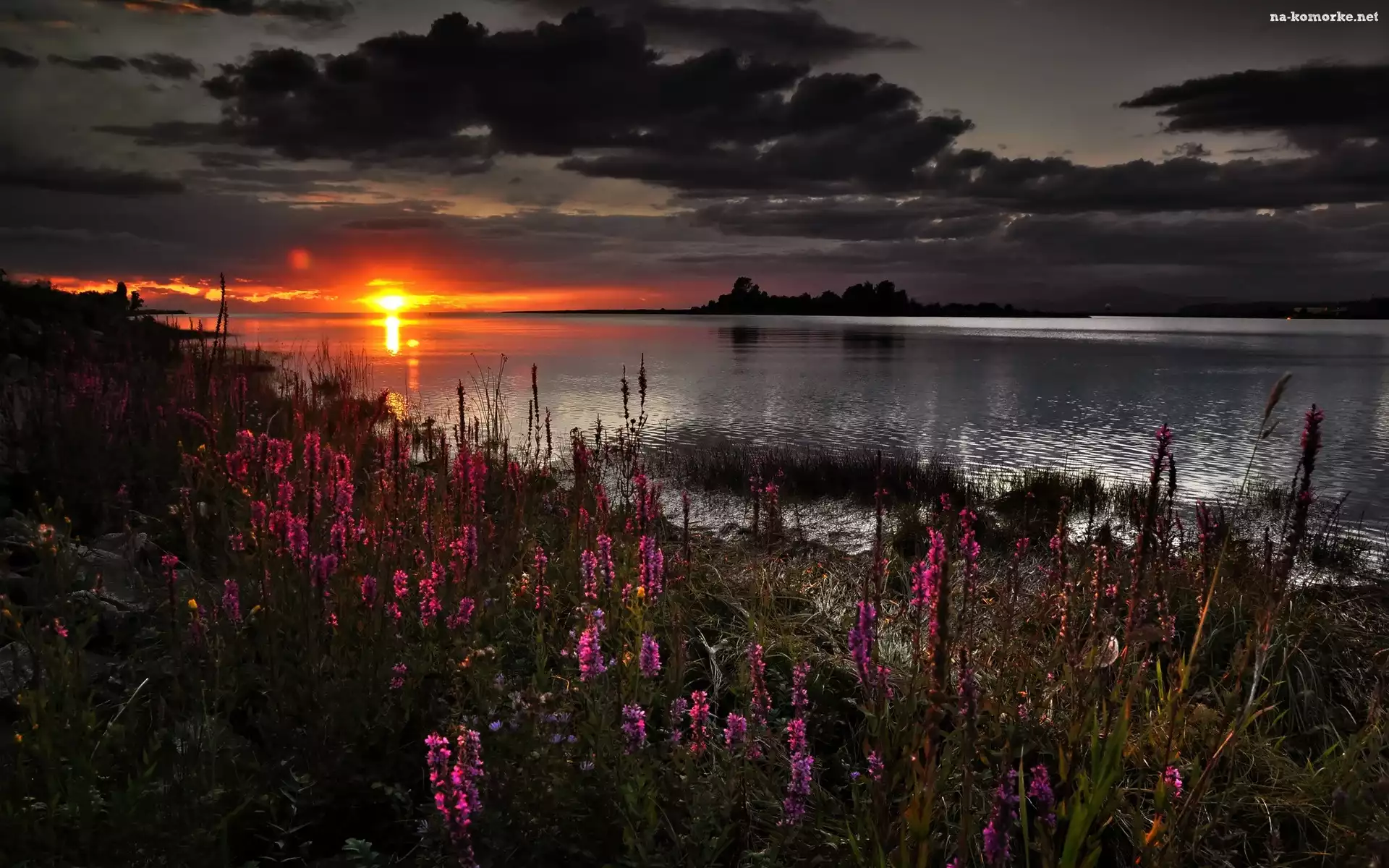 Jezioro, Kwiaty, Zachód, Słońca na Komórkę