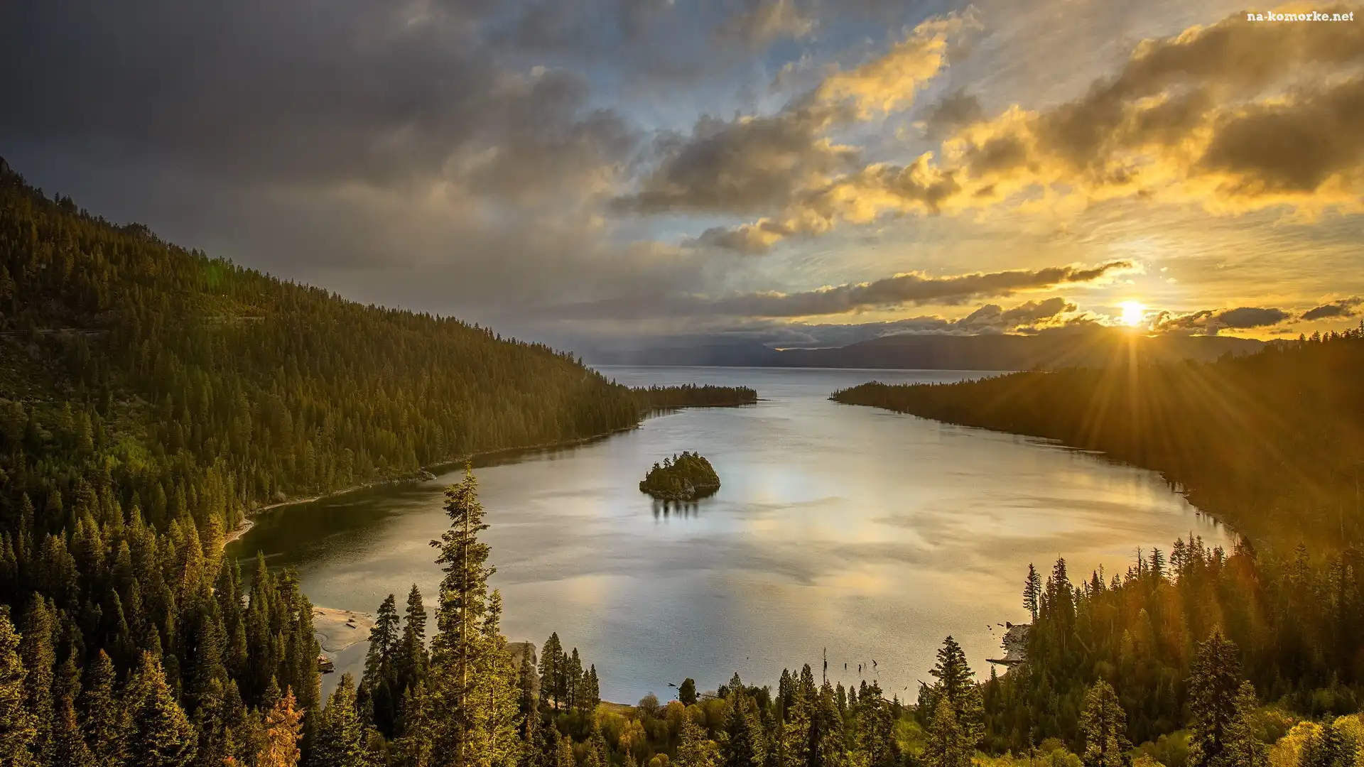 Jezioro, Wyspa, Las, Zachód Słońca na Komórkę