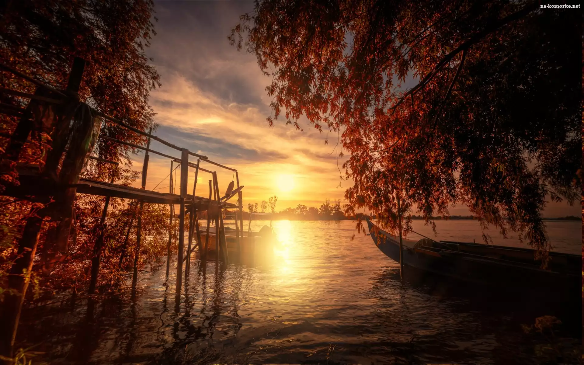 Jezioro, Drzewa, Łodzie, Zachód słońca na Komórkę