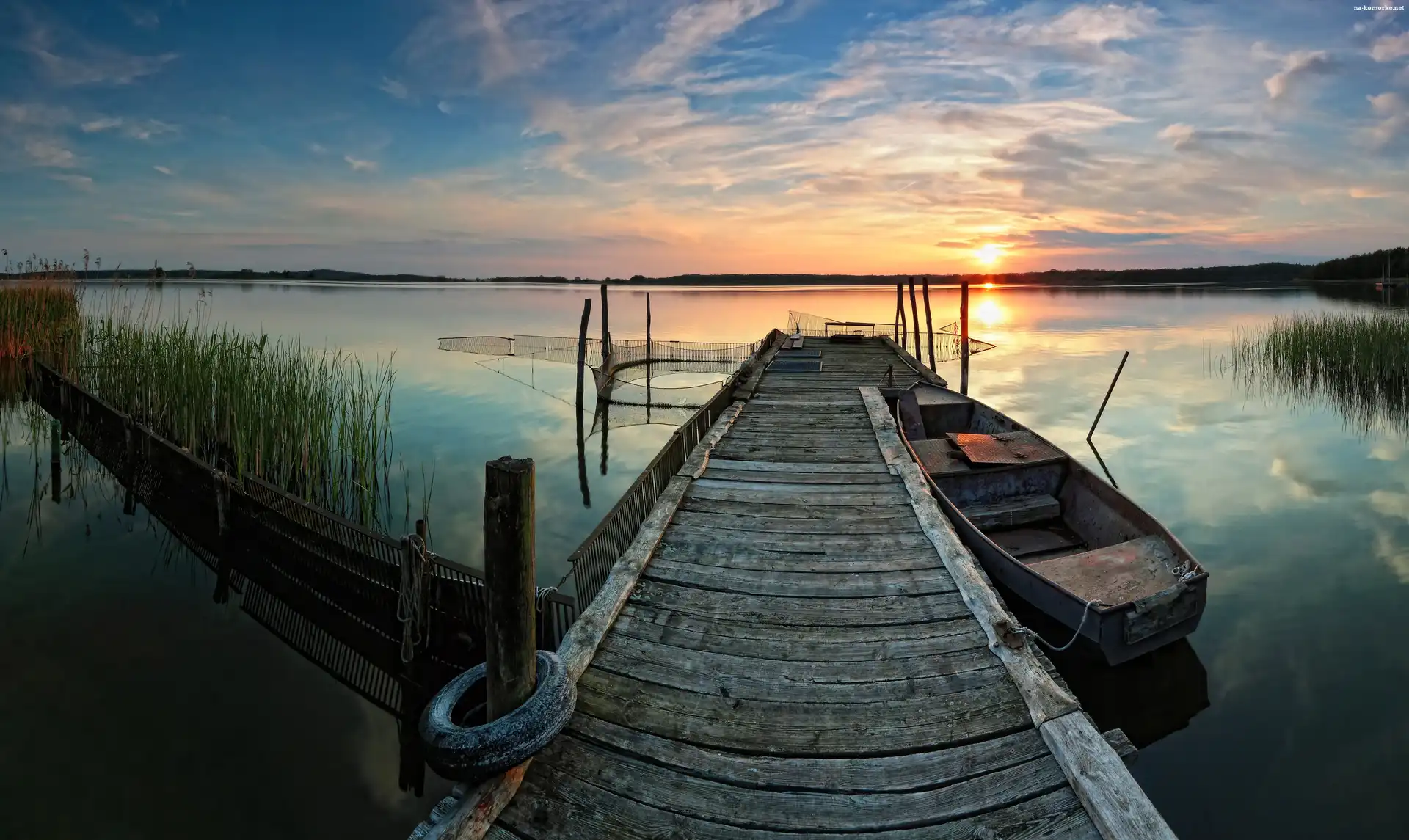Łódka, Zachód, Słońca, Jezioro, Molo na Komórkę