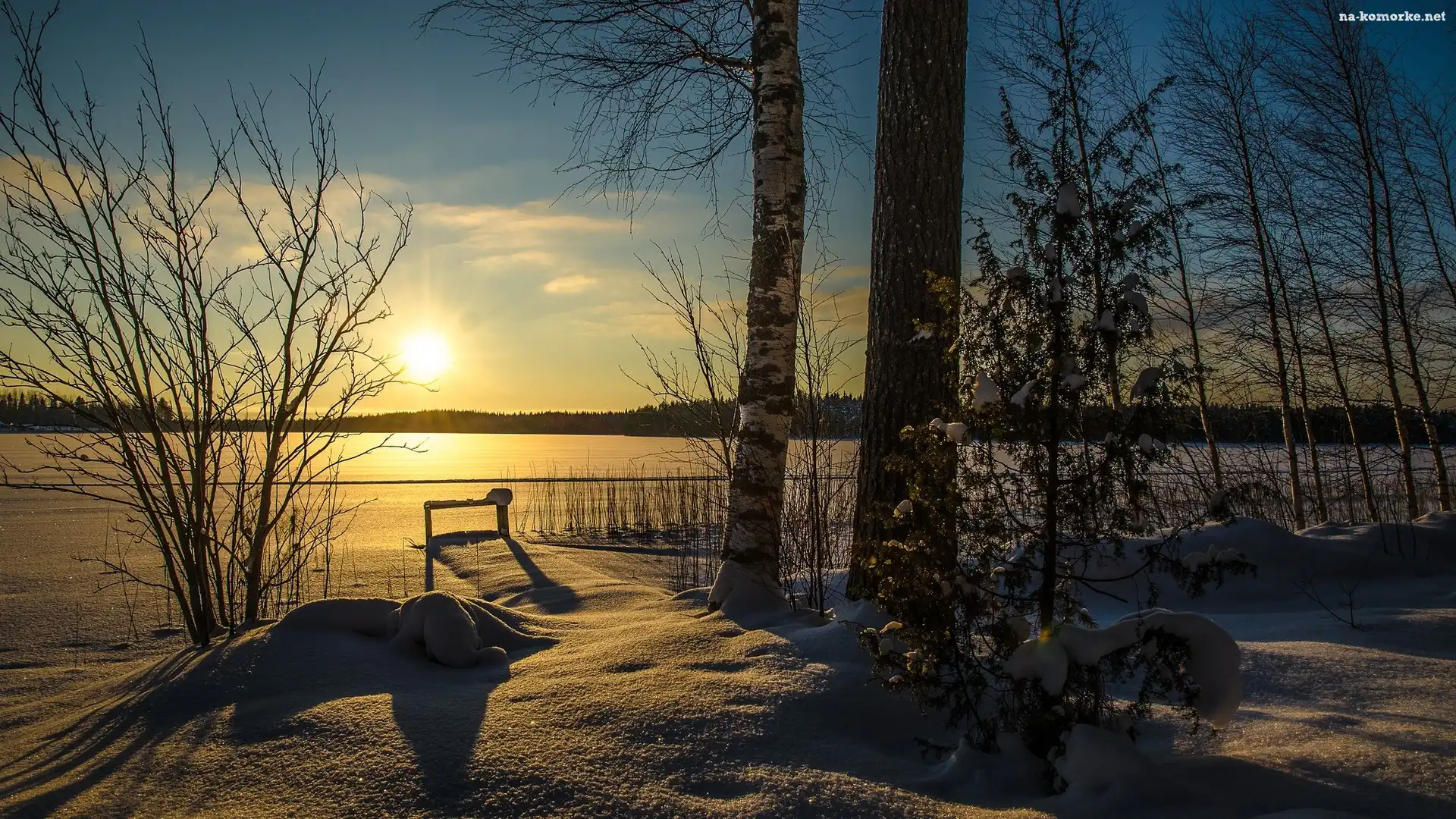 Śnieg, Zima, Drzewa, Jezioro, Słońce na Komórkę