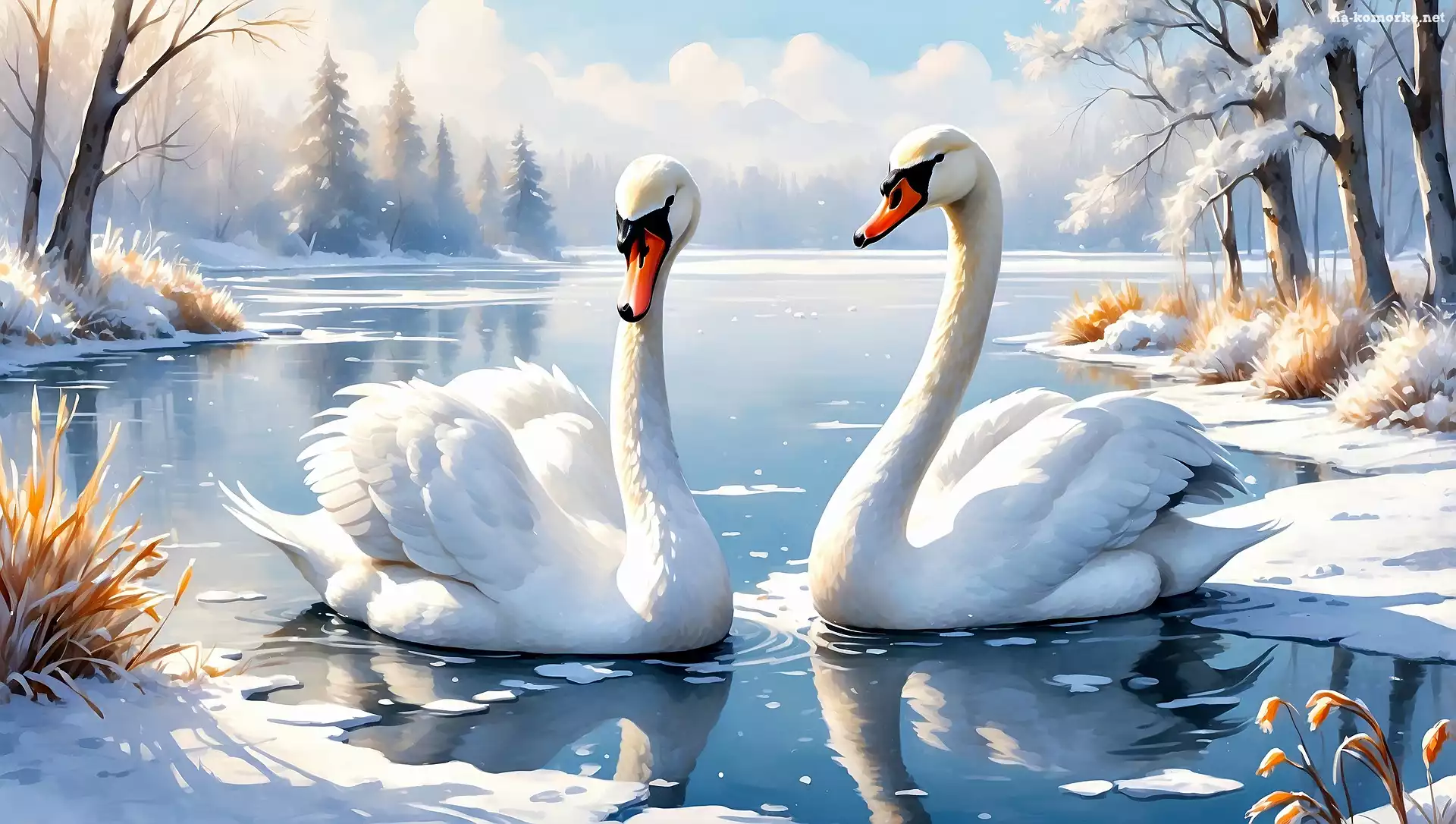 Dwa, Jezioro, Zima, Łabędzie, Grafika na Komórkę