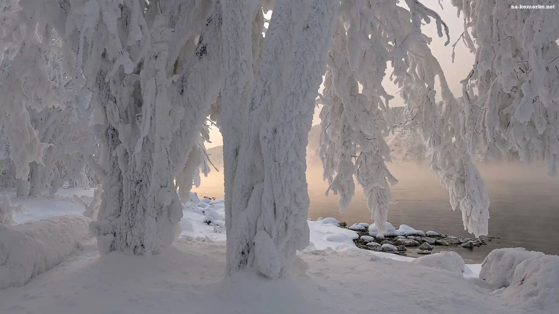 Jezioro, Drzewa, Ośnieżone, Mgła, Zima, Kamienie na Komórkę
