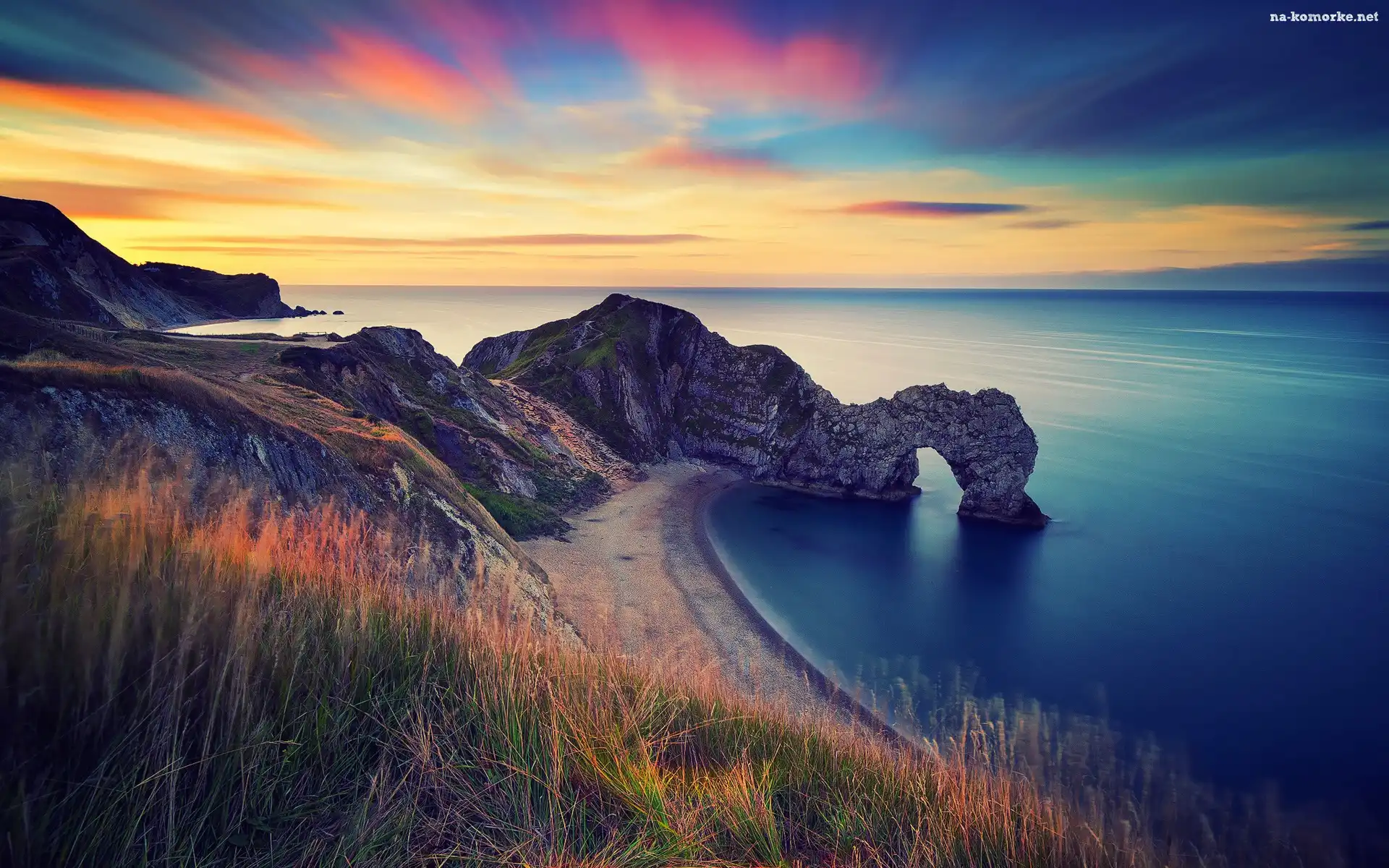 Anglia, Skały, Plaża, Morze, Wybrzeże Jurajskie, Łuk wapienny Durdle Door, Zachód słońca na Komórkę