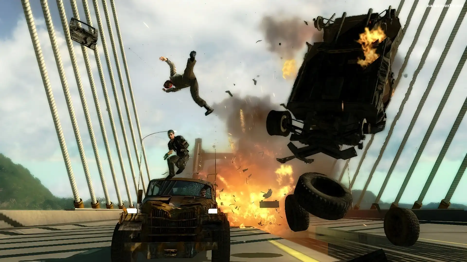 Just Cause 2, Gra, Akcji Tir, policja, lecący, samochód Just Cause 2, Limited Edition Just Cause 2, Skuter, Wodny Just Cause 2, Ostrzał, Wioski Just Cause 2, Spadochroniarz, Widok Z, Gry, Just Cause 2, Obraz Just Cause 2, Rakiet, Wyrzutnia Just Cause 2, Wybuch, Samochodu Just Cause 2, Screenshot Just Cause, Pożar, Most, Samochody Just Cause 1 Just Cause 1, Spadochronie, Skok, Na Just Cause 1