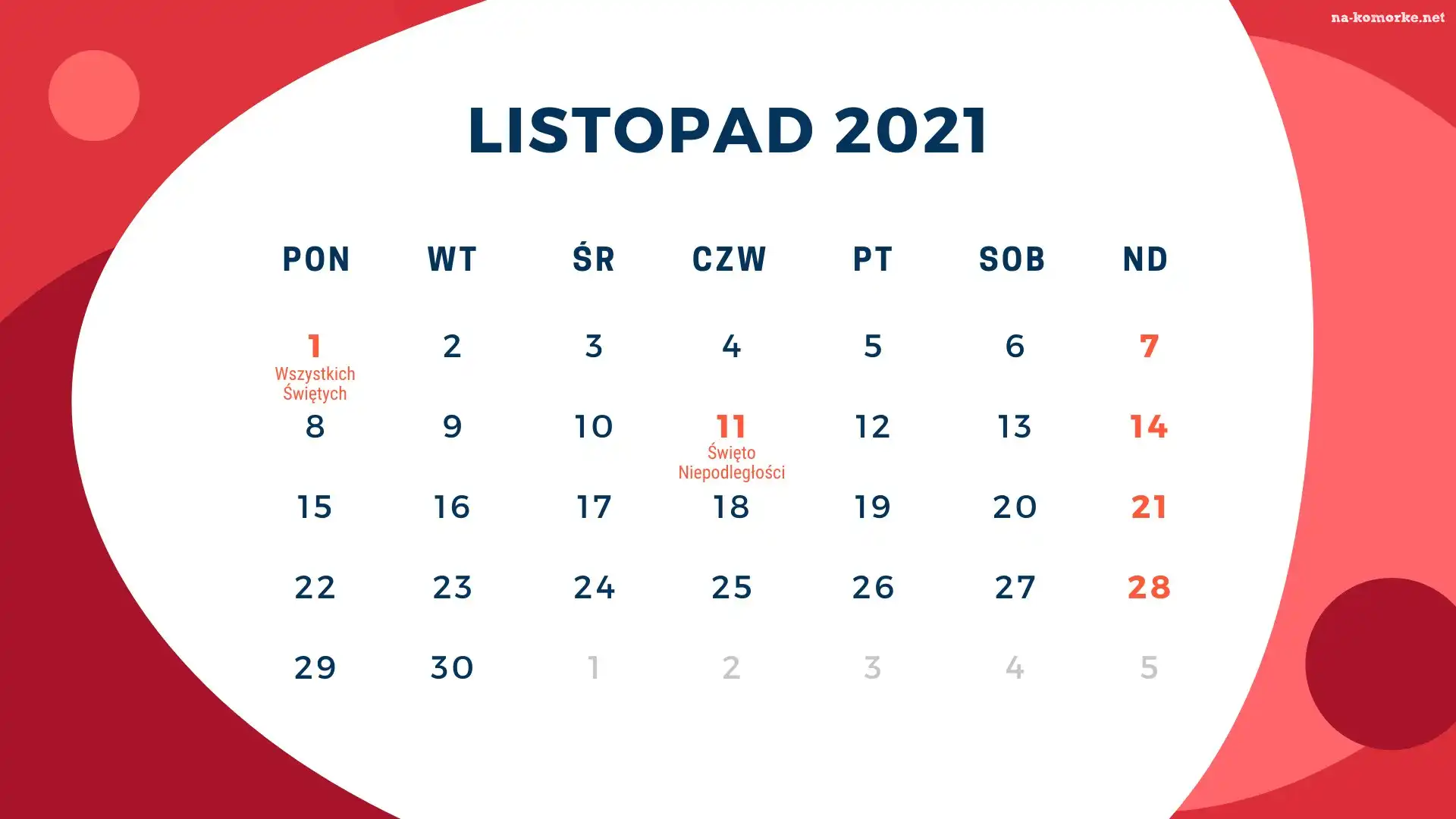 Kalendarz, 2021, Miesiąc, Listopad na Komórkę