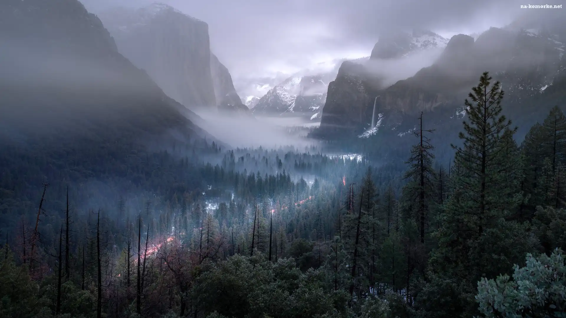 Kalifornia, Drzewa, Park Narodowy Yosemite, Stany Zjednoczone, Mgła, Góry na Komórkę