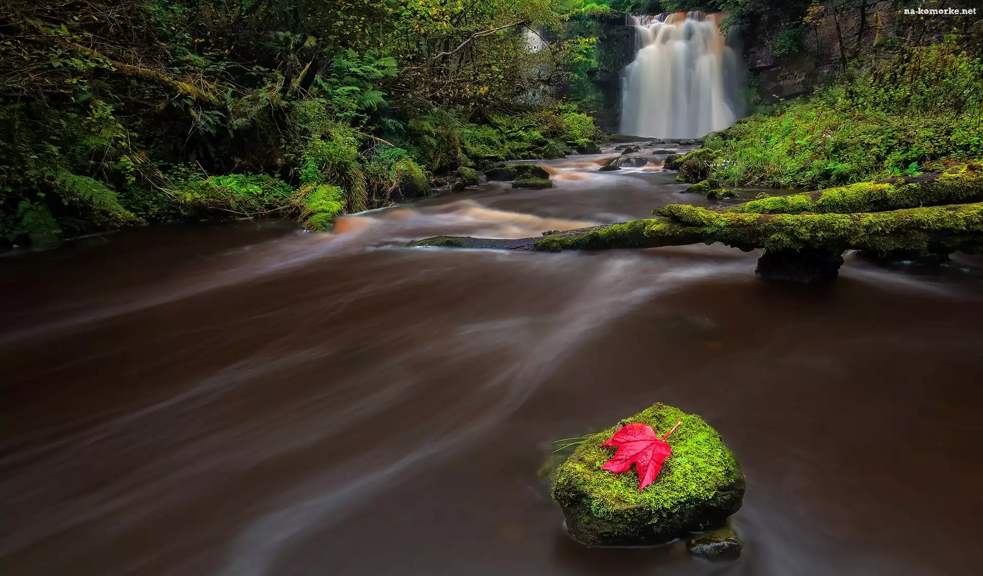 Rzeka, Miejscowość Dalry, Szkocja, Liść, Wodospad Linn Spout, Kamień na Komórkę