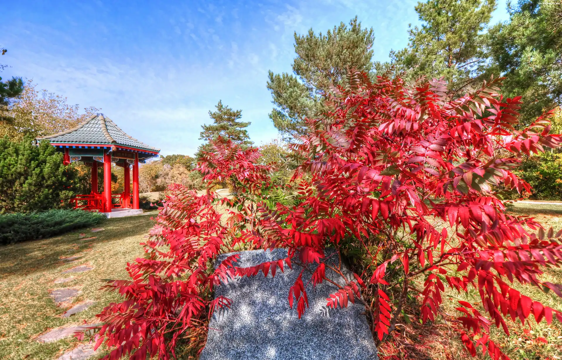 Kamień, Krzewy, Ogród, Altana, Drzewa, Czerwona na Komórkę