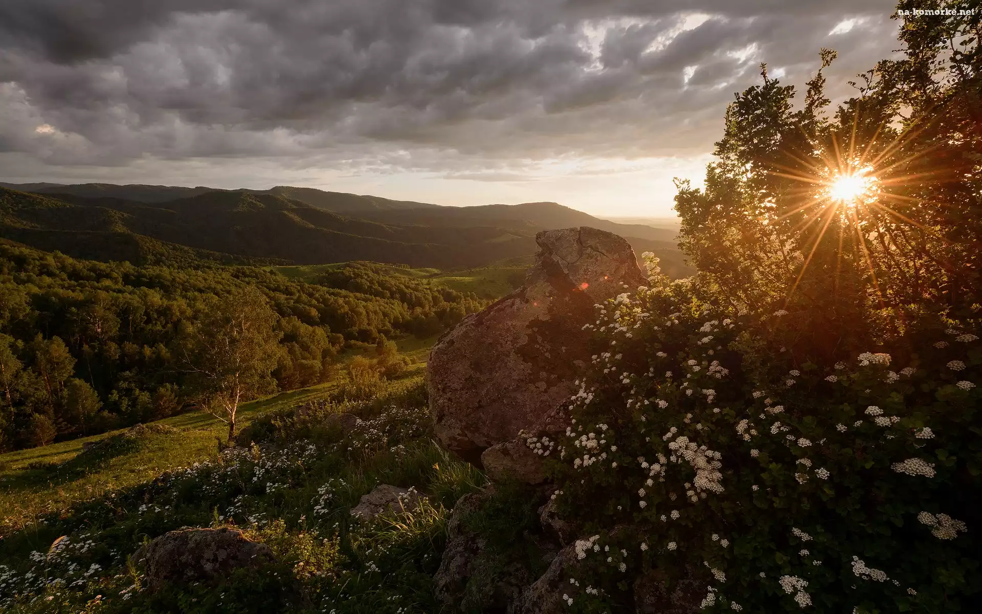 Góry, Kamień, Promienie słońca, Dolina, Rośliny, Drzewa, Kwiaty na Komórkę