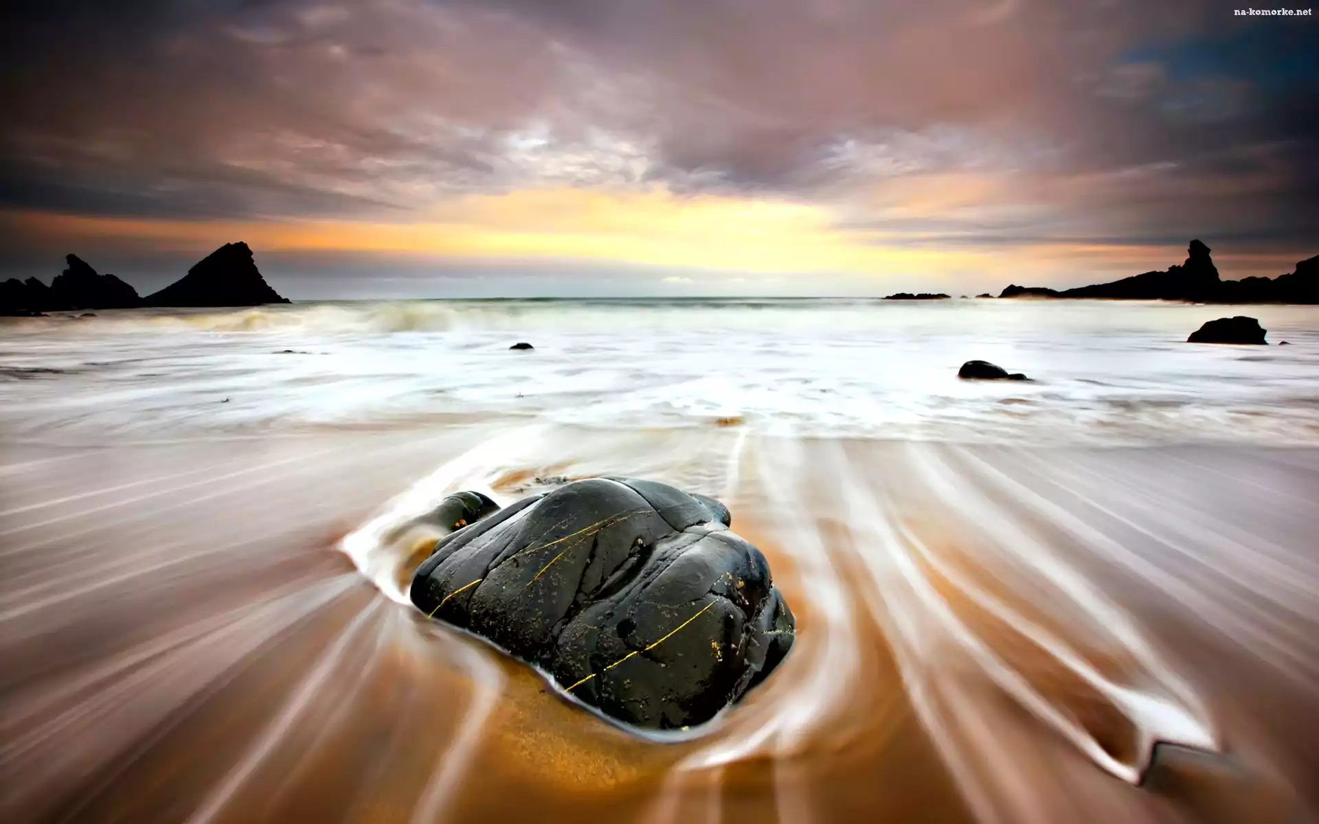 Kamień, Zachód, Słońca, Morze, Skały na Komórkę
