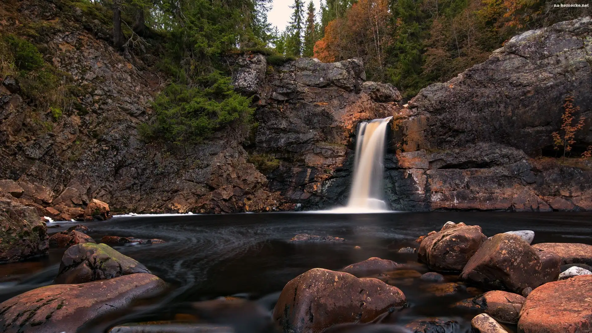 Kamienie, Wodospad, Skały, Drzewa, Rzeka na Komórkę