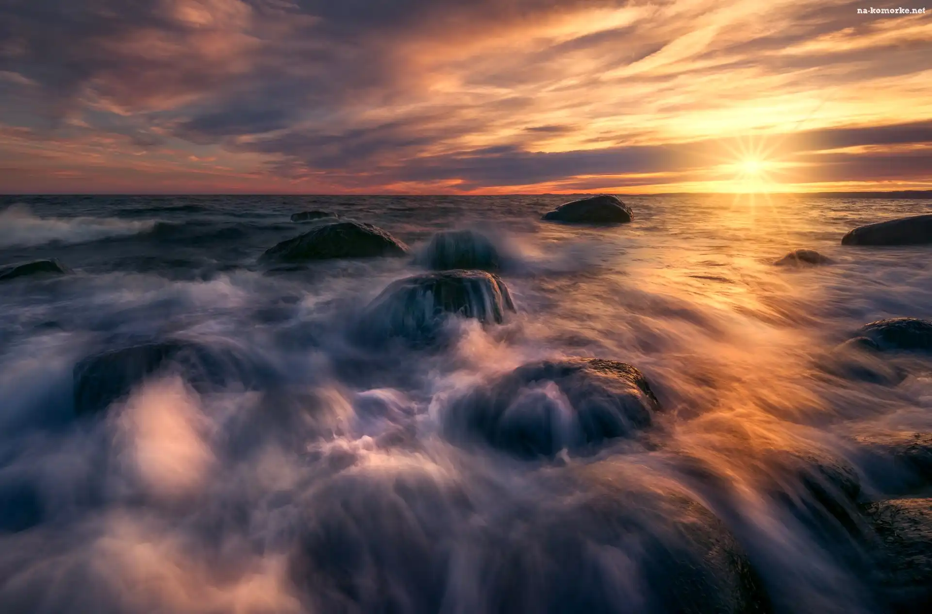 Kamienie, Zachód słońca, Morze, Fale, Skały na Komórkę