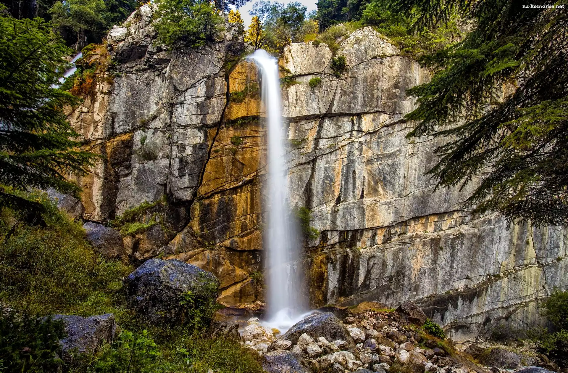 Kamienie, Wodospad, Skały, Gałązki, Świerk na Komórkę