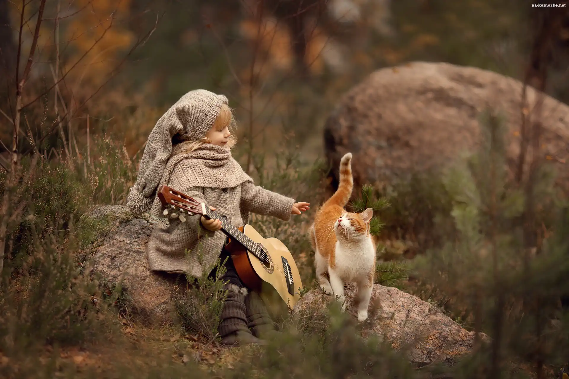 Kamienie, Jesień, Dziewczynka, Gitara, Kot na Komórkę