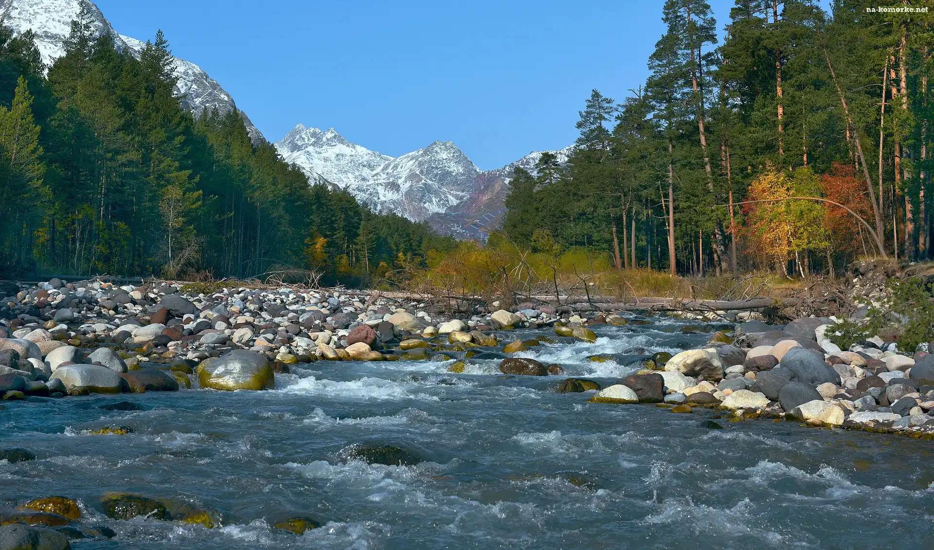 Rzeka Baksan, Kabardo-Bałkaria, Rosja, Las, Góry, Kaukaz, Kamienie na Komórkę