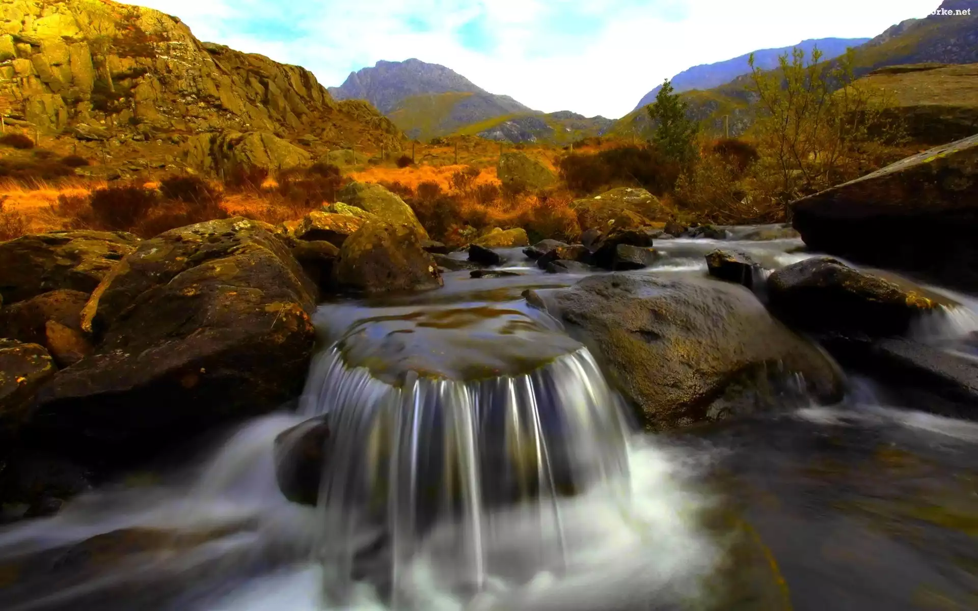 Kamienie, Rzeczka, Wodospad, Krzewy, Góry na Komórkę