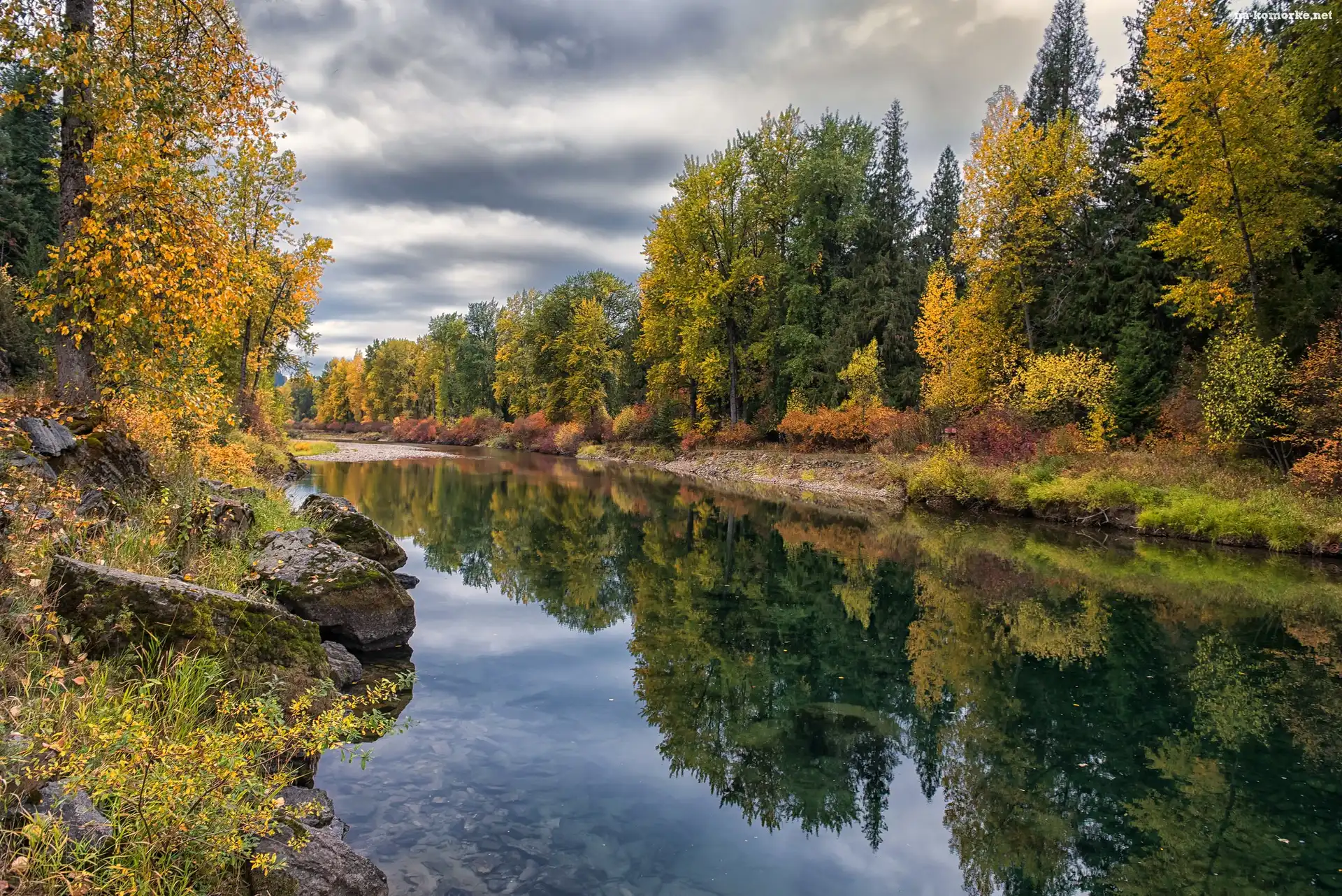 Rzeka, Jesień, Drzewa, Kamienie, Liście, Pożółkłe na Komórkę
