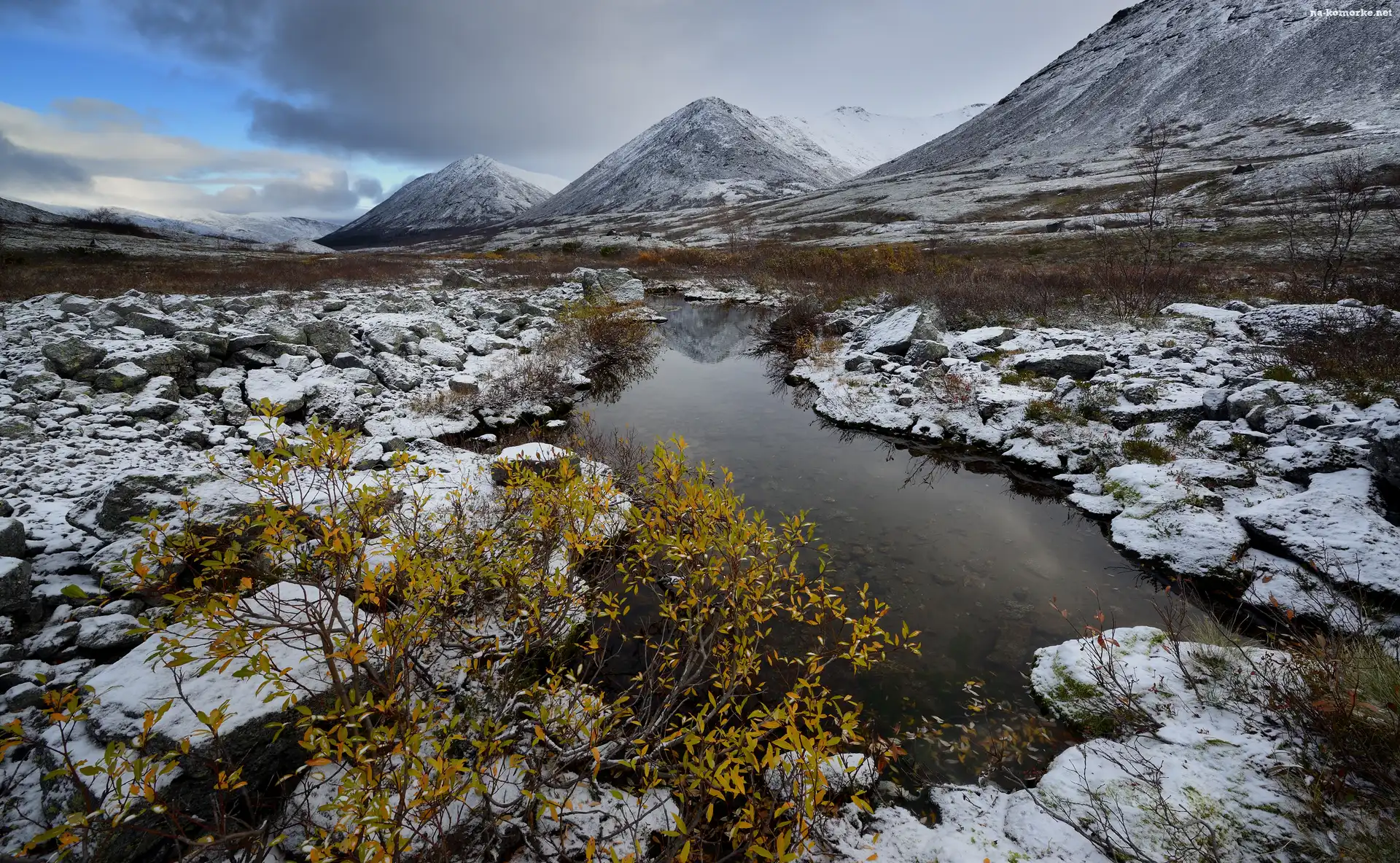 Chibiny, Rosja, Rzeczka, Góry, Rośliny, Półwysep Kolski, Zima, Drzewa, Kamienie na Komórkę