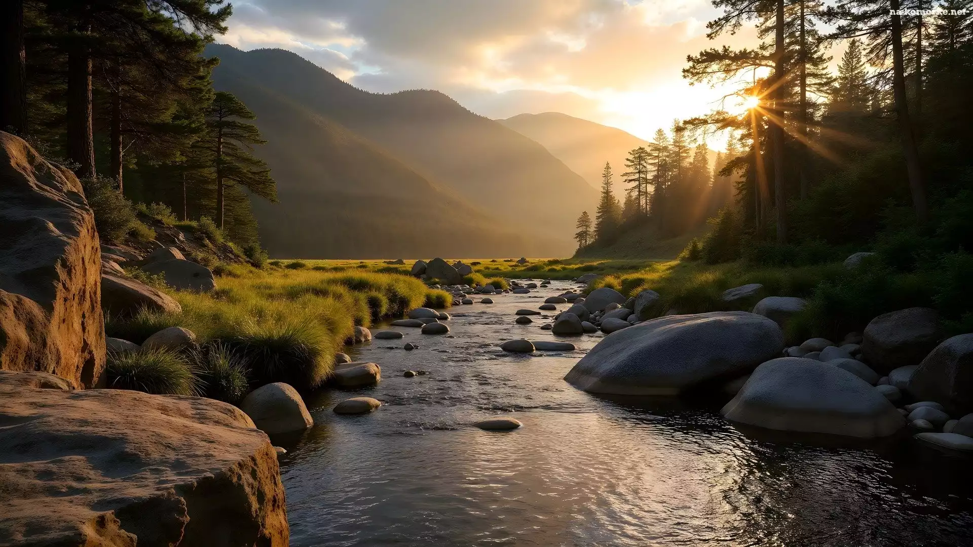 Promienie słońca, Rzeka, Góry, Grafika AI, Drzewa, Kamienie na Komórkę