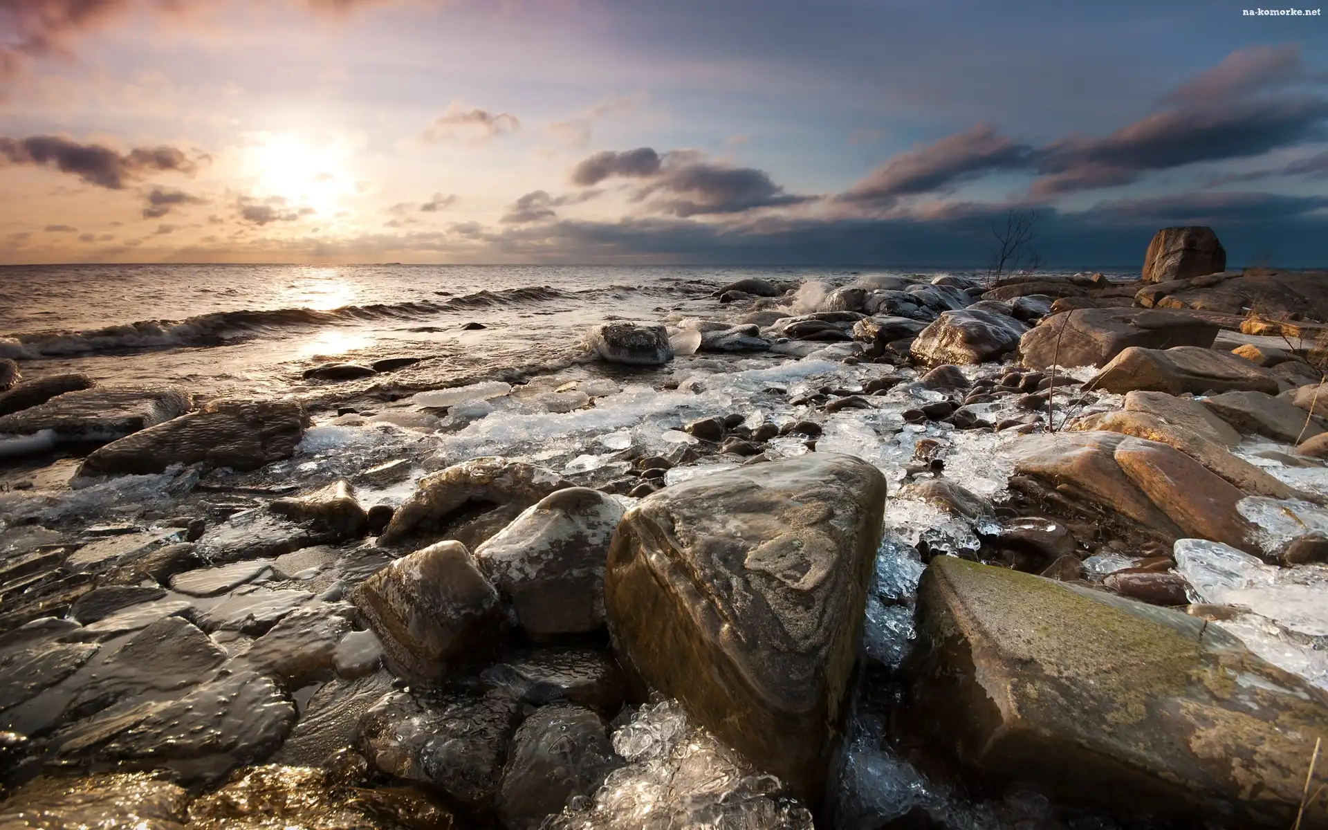 Kamienie, Morze, Zachód, Słońca, Chmury na Komórkę