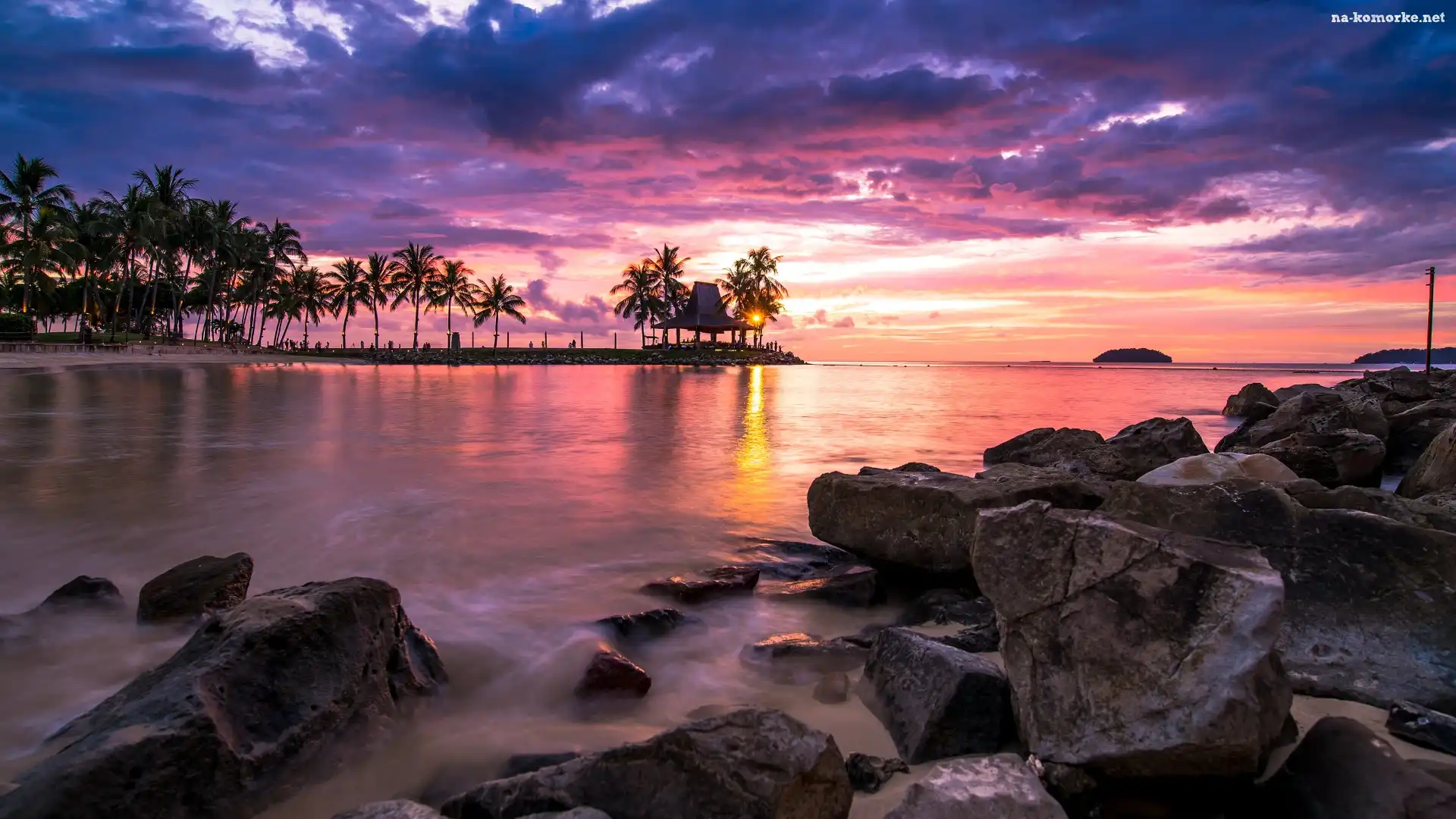 Chmury, Zachód słońca, Brzeg, Tropiki, Morze, Palmy, Kamienie na Komórkę