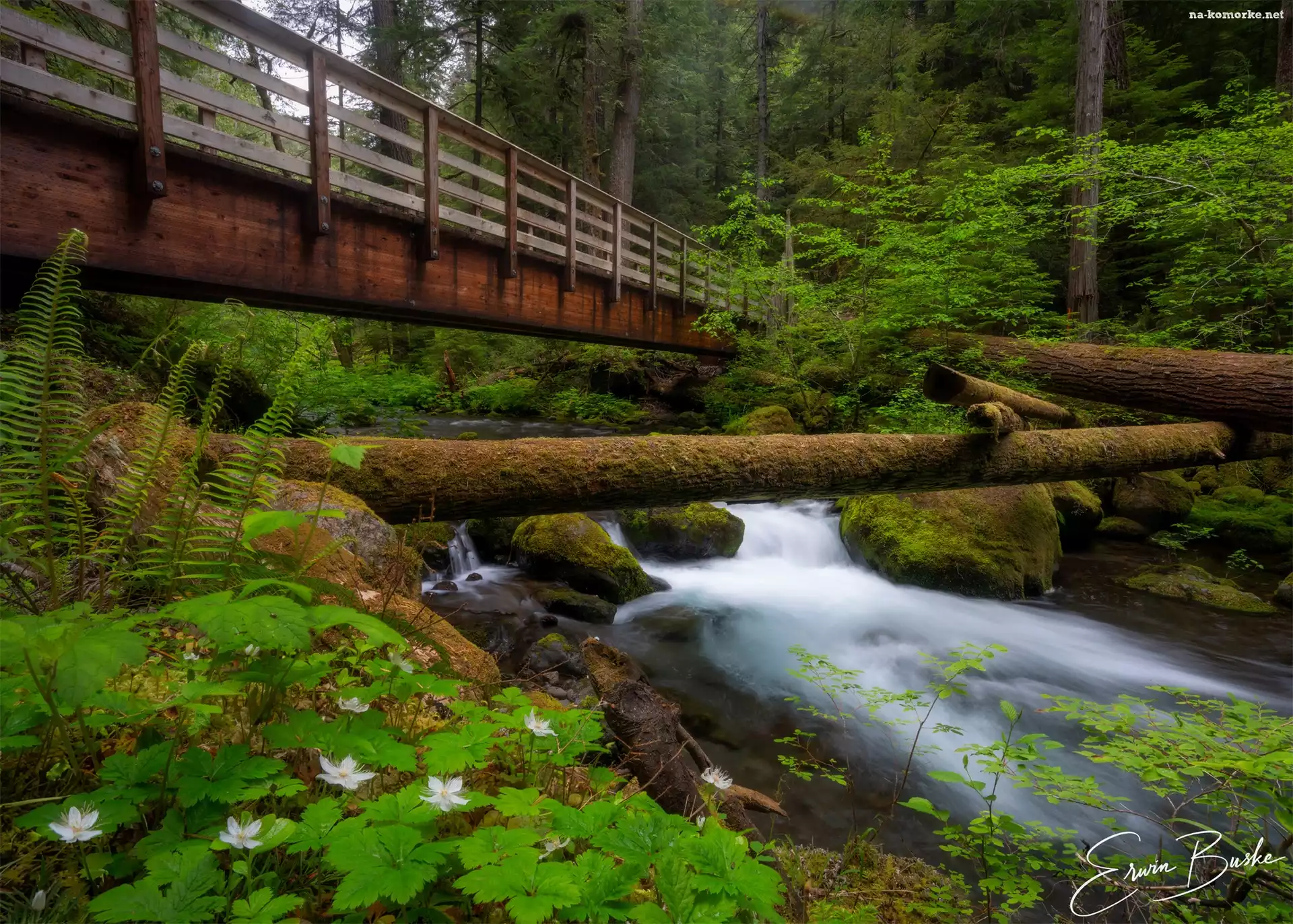 Powalone, Omszałe, Rzeka, Most, Stan Waszyngton, Kwiaty, Kamienie, Drzewa, Drzewa, Paprocie, Stany Zjednoczone, Big Quilcene na Komórkę |
