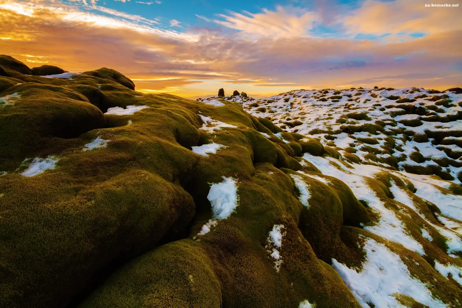 Śnieg, Zachód, Słońca, Kamienie, Mech na Komórkę