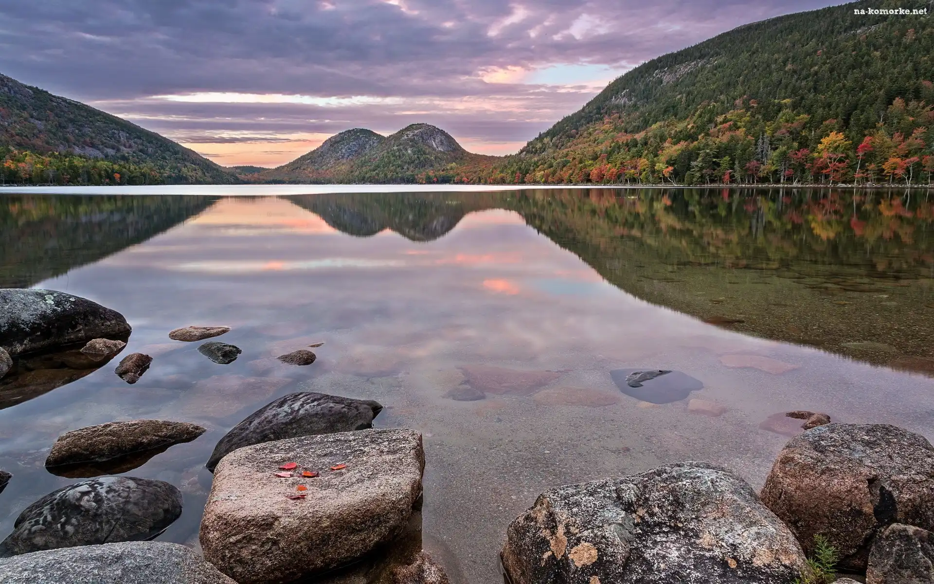 Kamienie, Jesień, Jezioro, Zalesione, Wzgórza na Komórkę