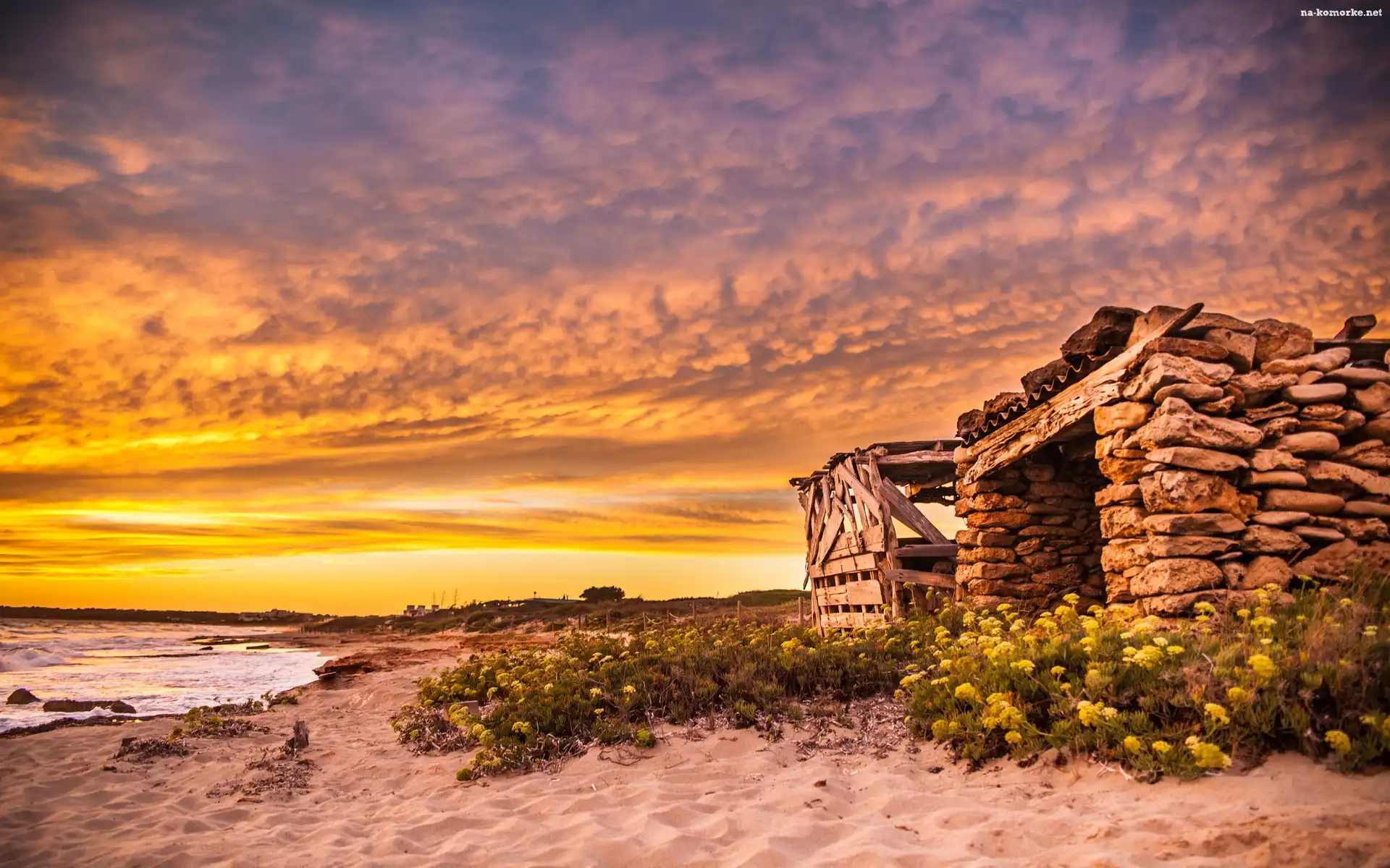 Kamienny, Zachód, Słońca, Plaża, Domek na Komórkę