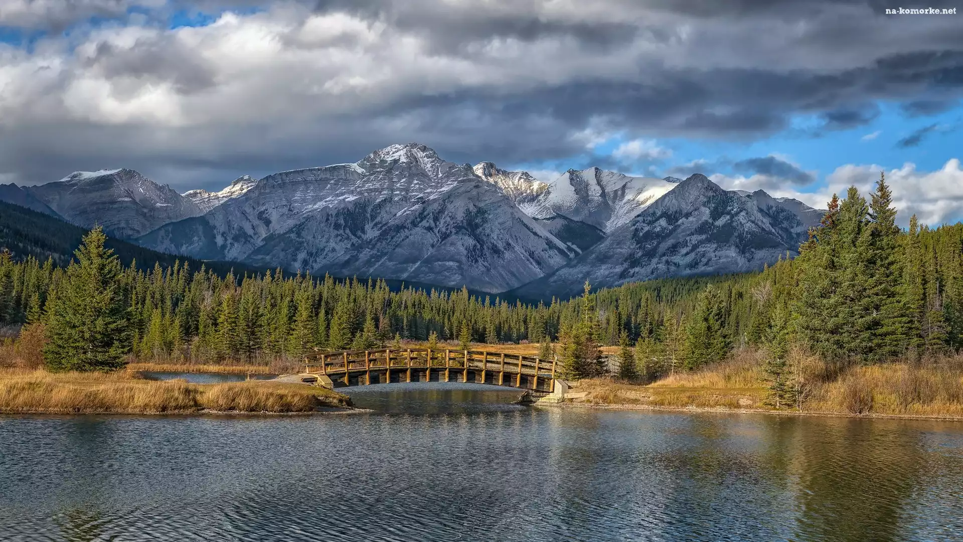 Góry, Prowincja Alberta, Herbert Lake, Kanada, Jezioro, Most, Drzewa, Park Narodowy Banff na Komórkę |
