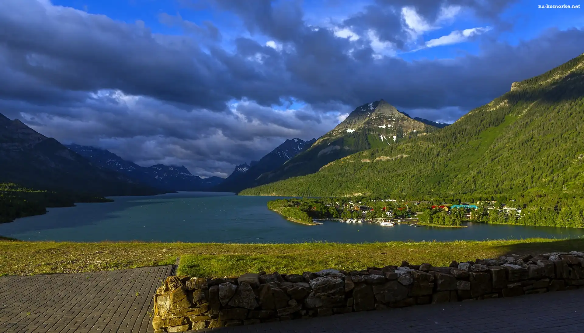 Kanada, Chmury, Góry, Jezioro, Budynki na Komórkę