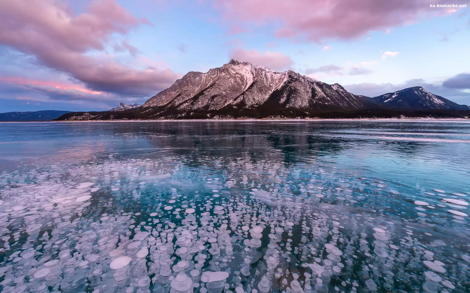 Góry, Alberta, Kanada, Góra Mount Michener, Zamarznięte, Jezioro Abraham, Zachód słońca na Komórkę