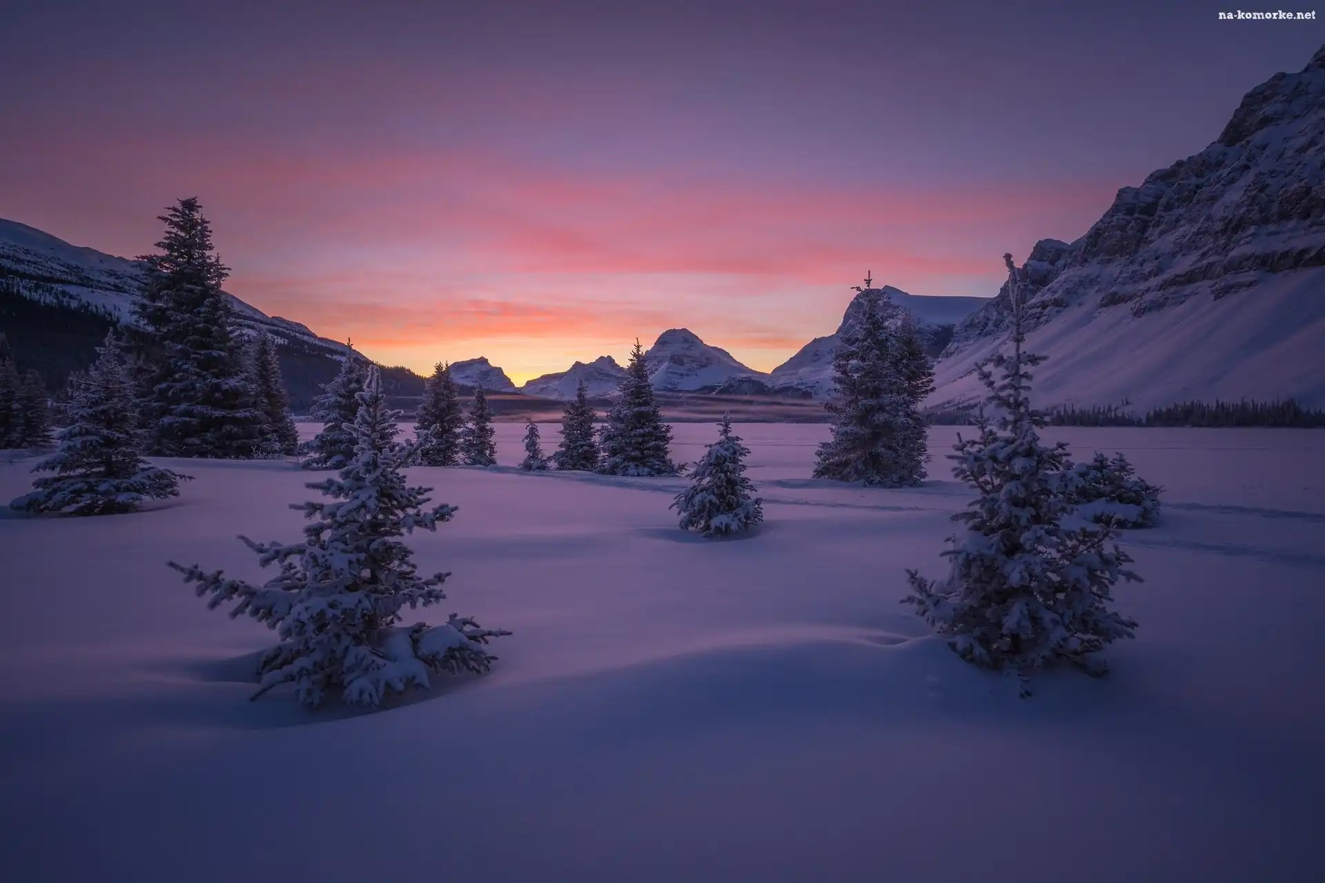 Kanada, Góra Crowfoot Mountain, Drzewa, Park Narodowy Banff, Zachód słońca, Jezioro Bow Lake, Alberta, Góry, Zima, Zamarznięte na Komórkę |