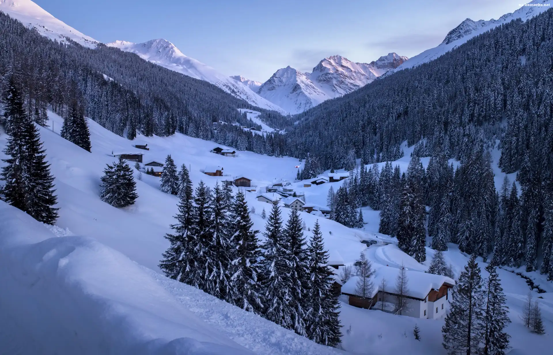 Szwajcaria, Drzewa, Kanton Gryzonia, Domy, Góry Alpy, Miasto Davos, Zima, Lasy na Komórkę