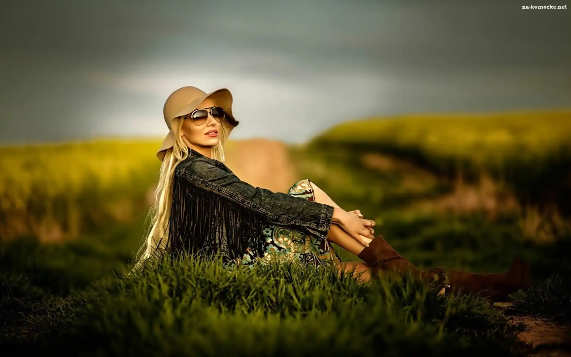 Łąka, Blondynka, Modelka, Kapelusz, Okulary na Komórkę