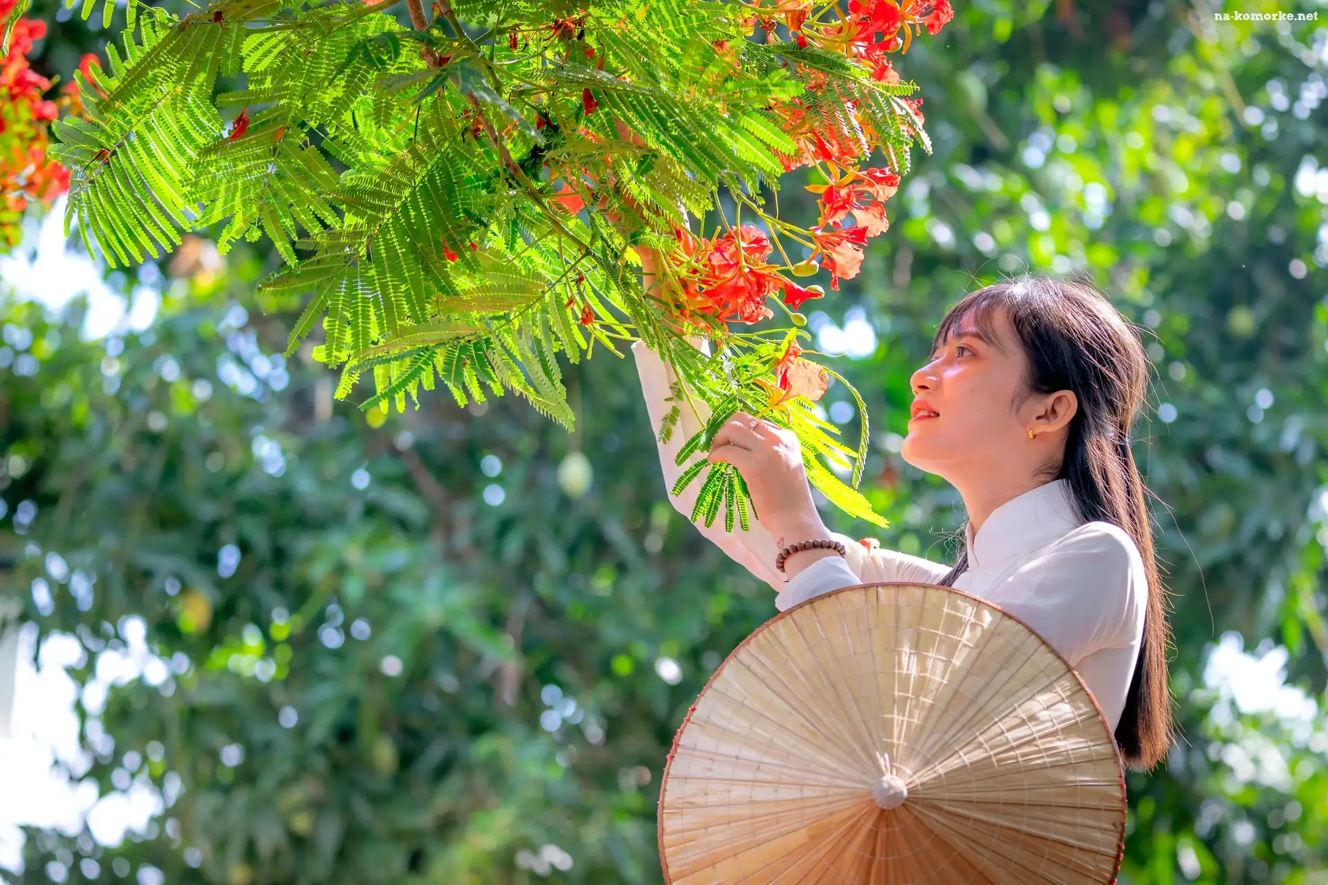 Drzewo, Kwiaty, Kobieta, Kapelusz na Komórkę