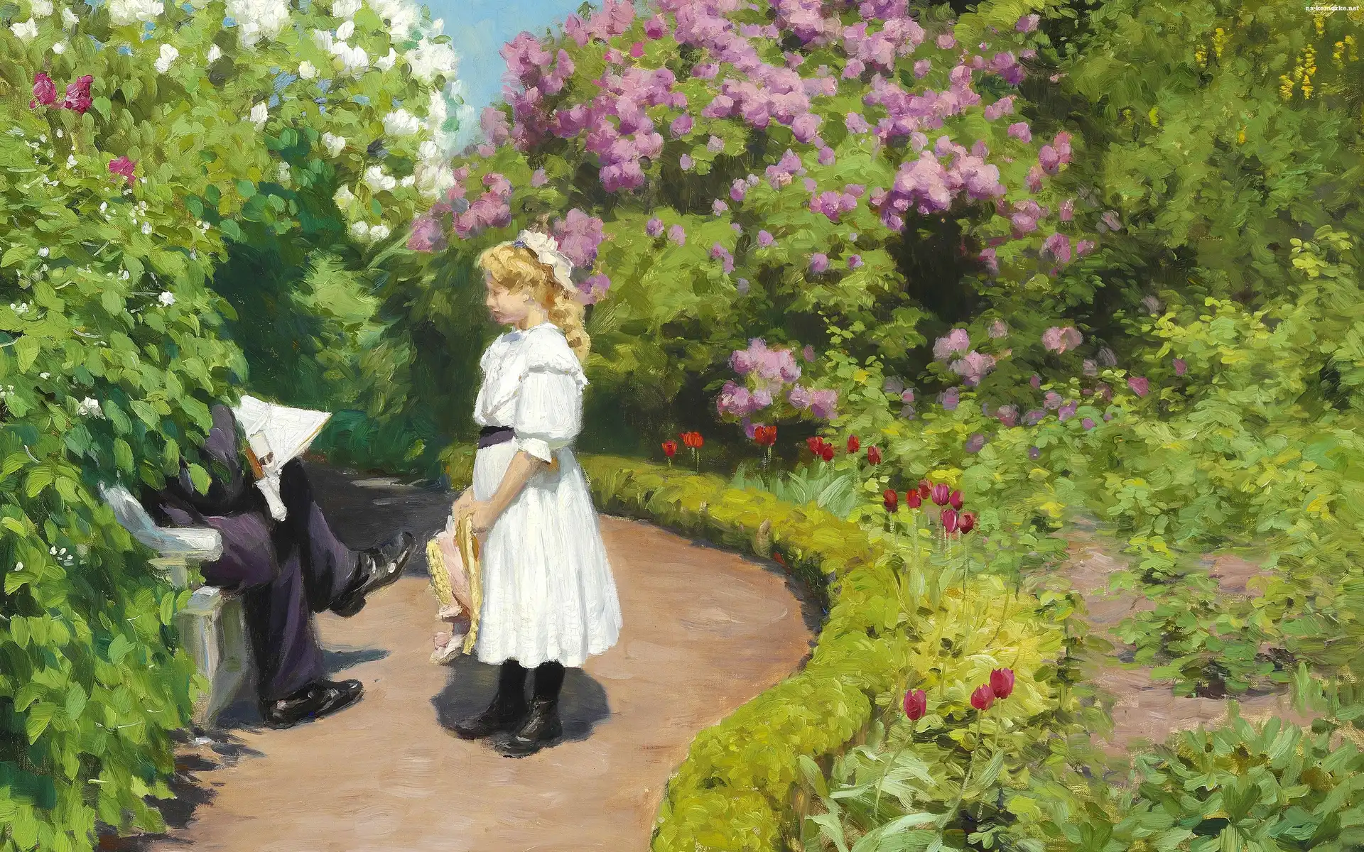 Park, Malarstwo, Hans Andersen Brendekilde, Ogród, Kwiaty, Dziewczynka, Kapelusz na Komórkę