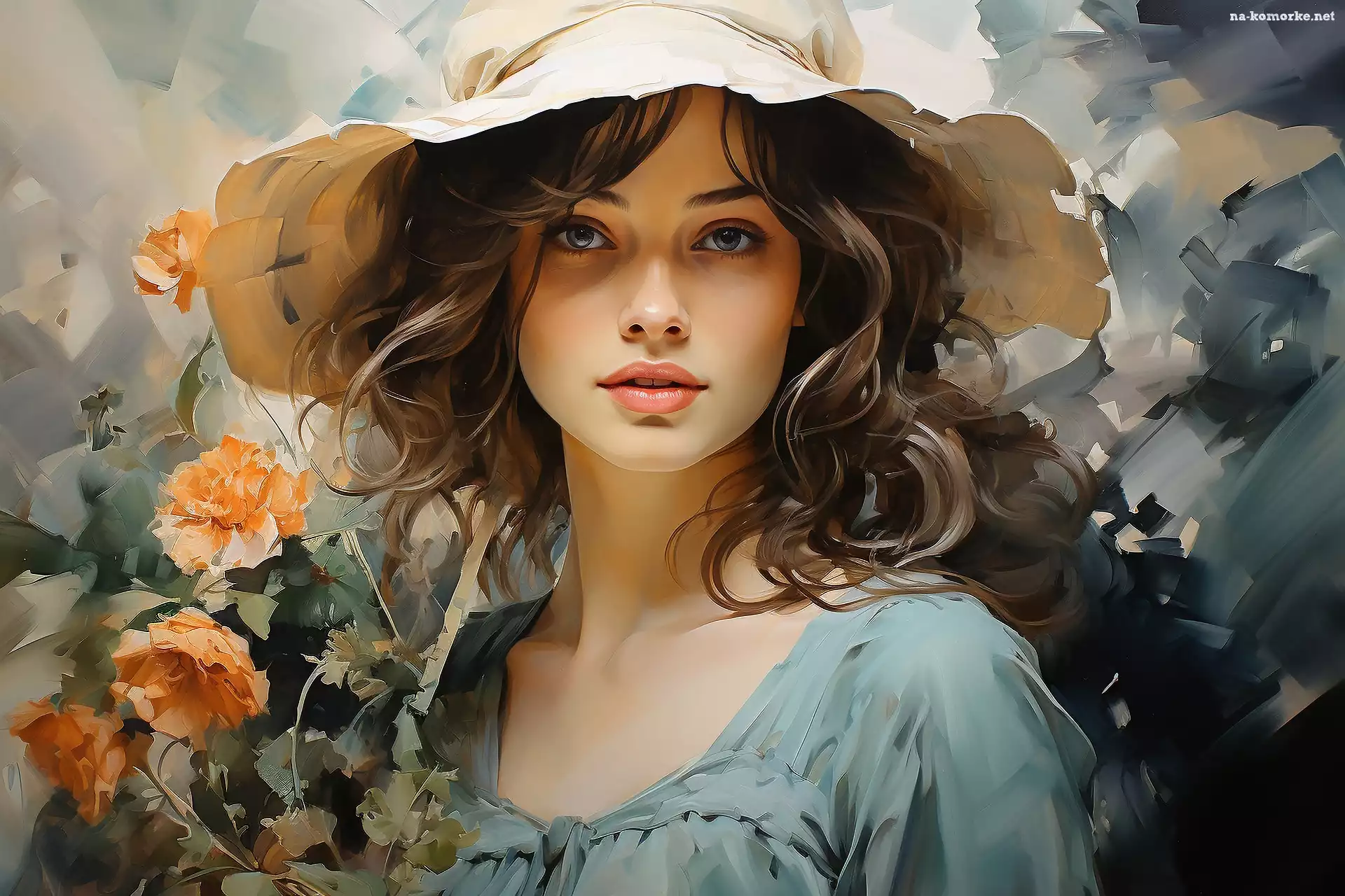 Kwiaty, Grafika, Kobieta, Kapelusz na Komórkę