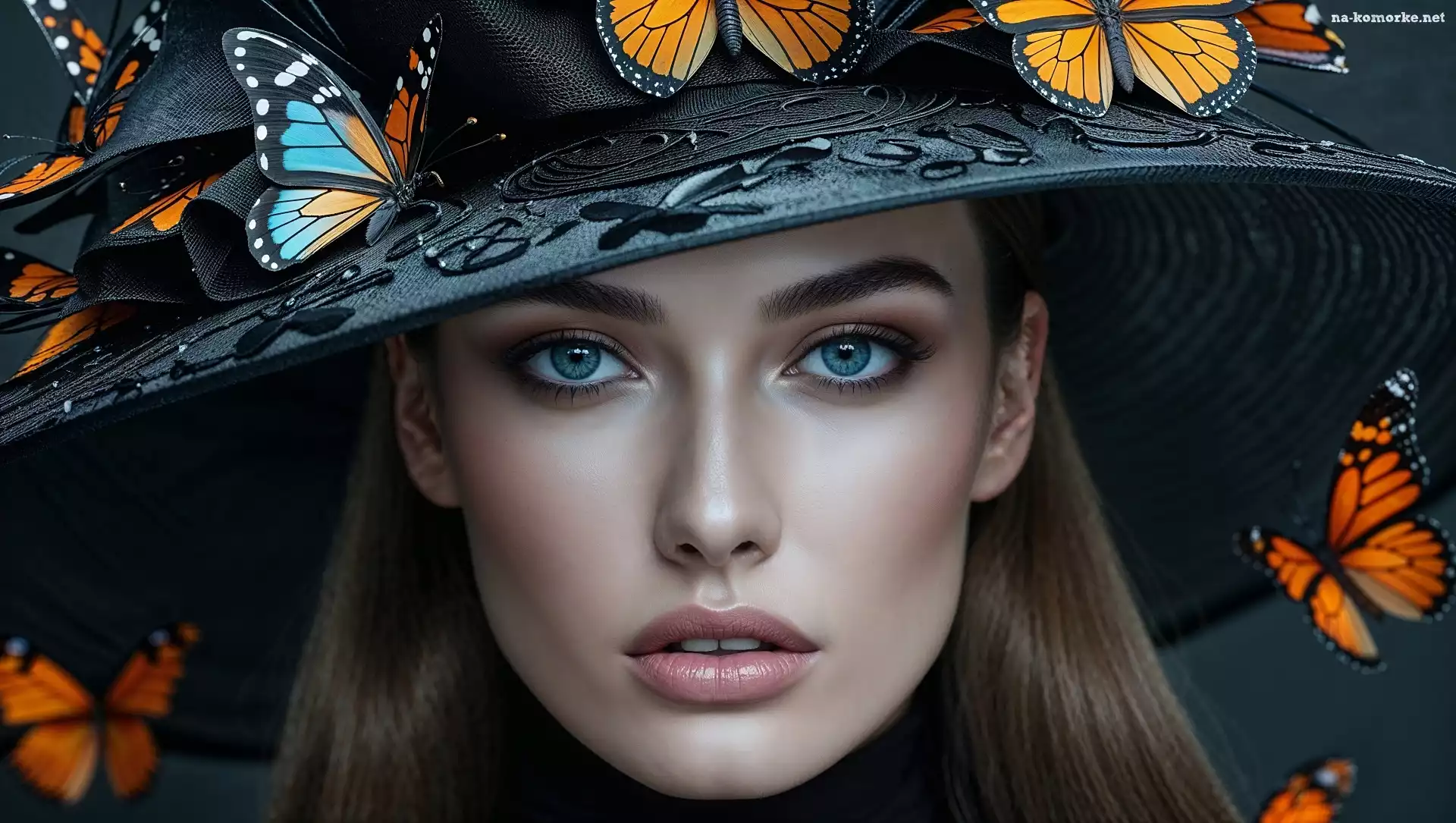 Kobieta, Kapelusz, Motyle, Spojrzenie, Grafika na Komórkę