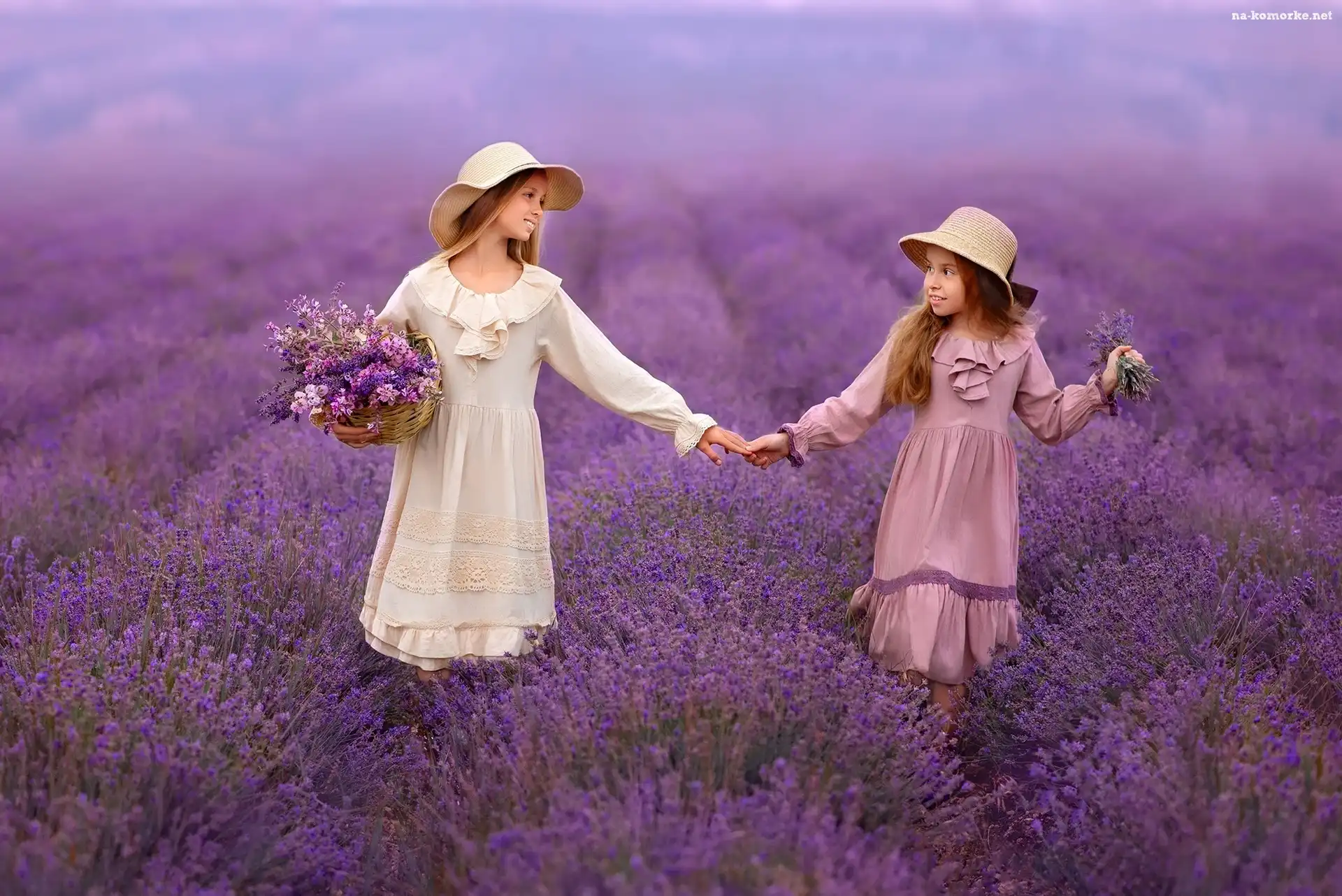 Kapelusze, Dziewczynki, Dwie, Lawenda, Sukienki, Kwiaty na Komórkę