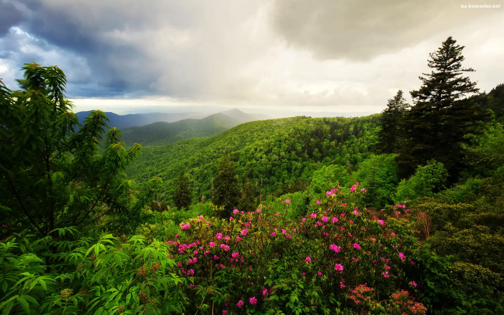 Las, Góry, Stany Zjednoczone, Chmury, Karolina Północna, Rododendrony, Drzewa, Appalachy, Kwiaty, Krzewy na Komórkę |