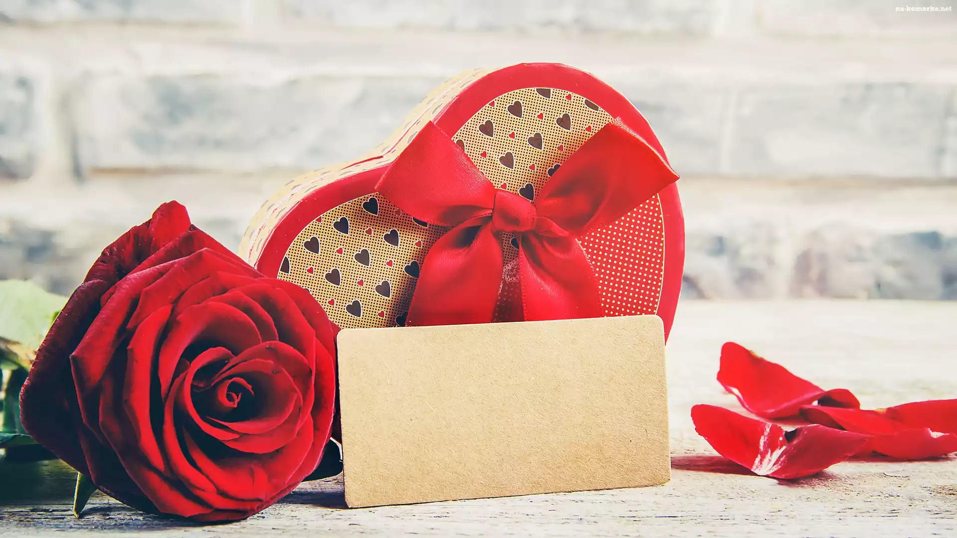 Czerwona, Karteczka, Pudełko, Walentynki, Róża, Wstążka, Czekoladki, Serce na Komórkę