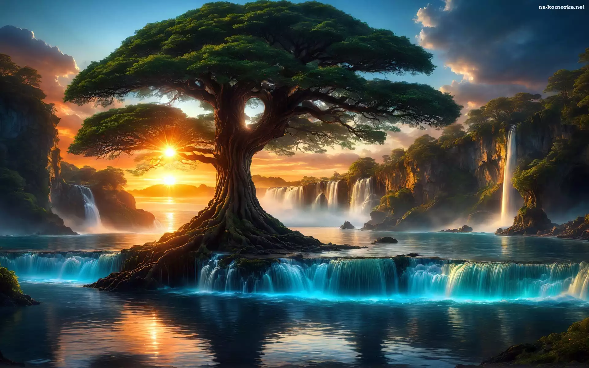 Zachód słońca, Chmury, Rzeka, 2D, Wodospady, Drzewo, Kaskada na Komórkę