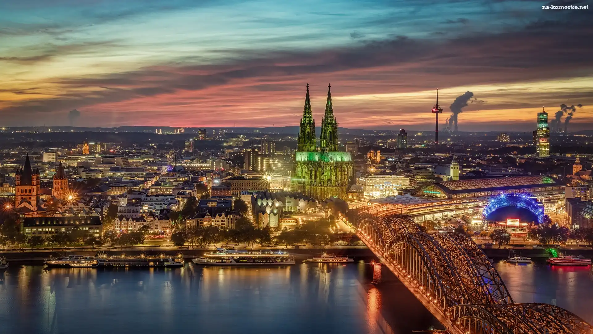 Niemcy, Światła, Miasto, Wschód słońca, Kolonia, Rzeka, Most Hohenzollernów, Katedra na Komórkę