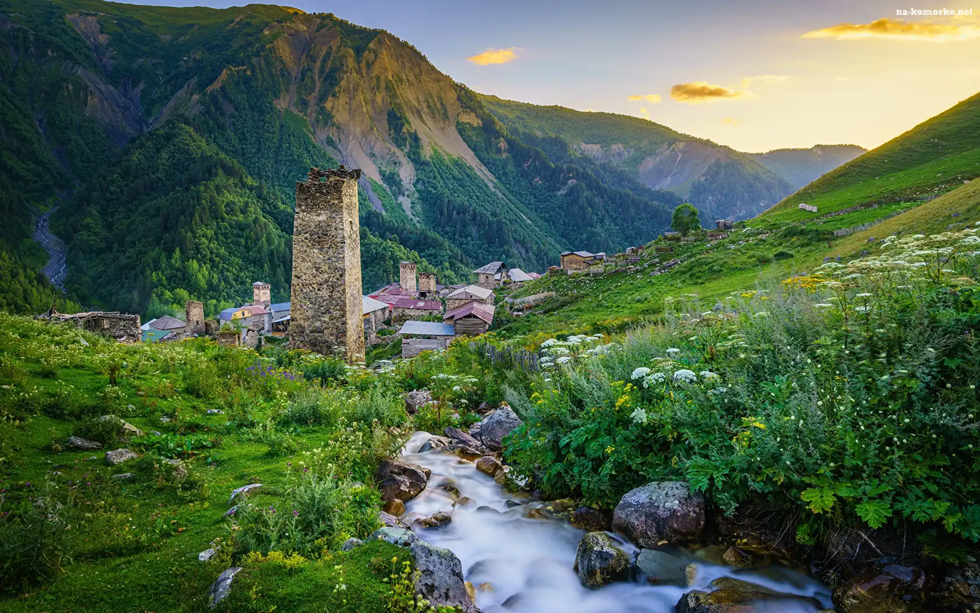 Gruzja, Domy, Strumień, Adishi, Kamienie, Kaukaz, Megrelia-Górna Swanetia, Ruina, Baszta, Góry na Komórkę |